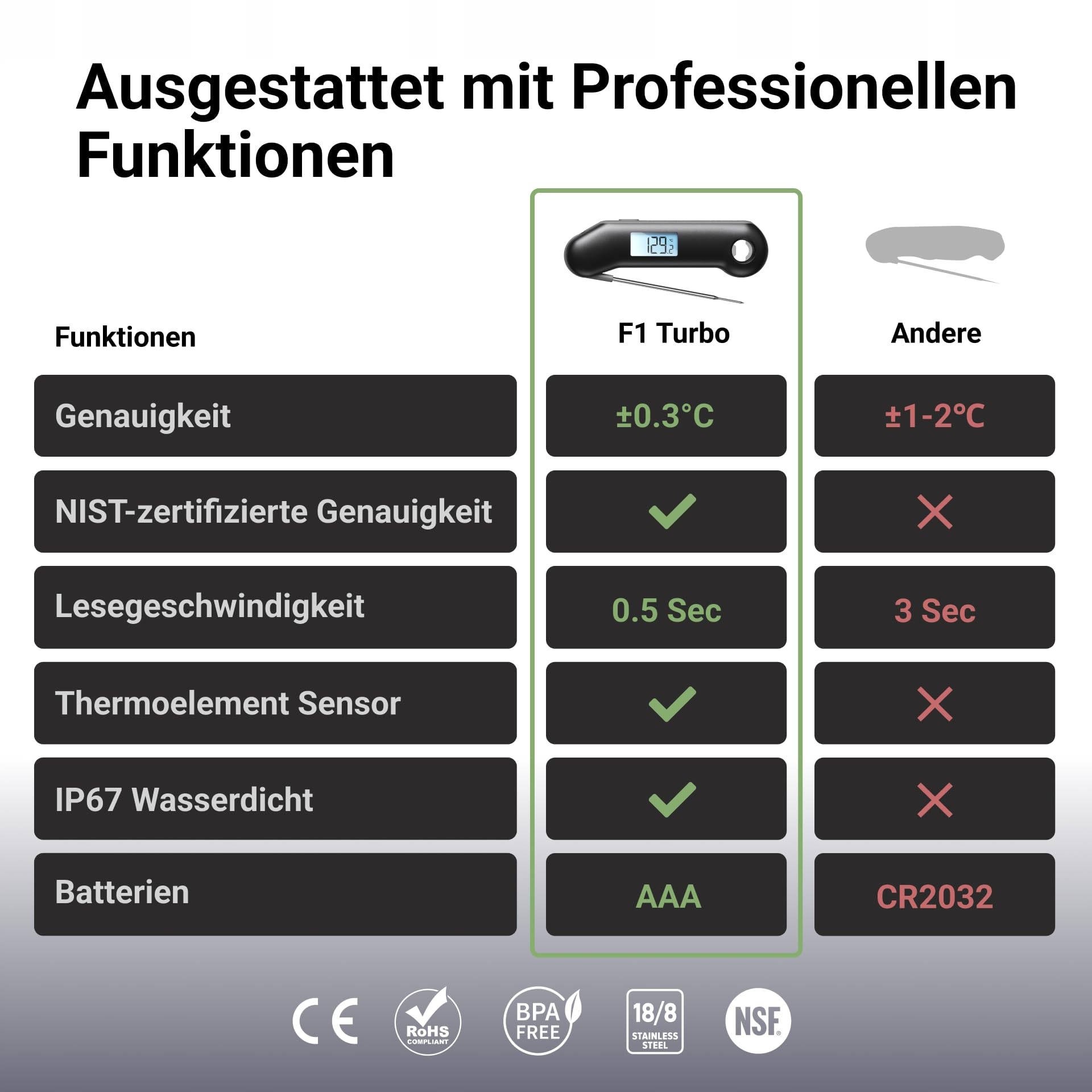 3X szybsze pomiary w 0,5 sekundy: Dzięki nowoczesnemu elementowi termicznemu, termometr do mięsa ThermoMaven F1 Turbo z natychmiastowym wyświetlaczem dostarcza szybkie pomiary w zaledwie 0,5 sekundy, 3x szybciej niż konkurencja, co zapewnia, że zawsze osiągasz najlepsze wyniki gotowania.