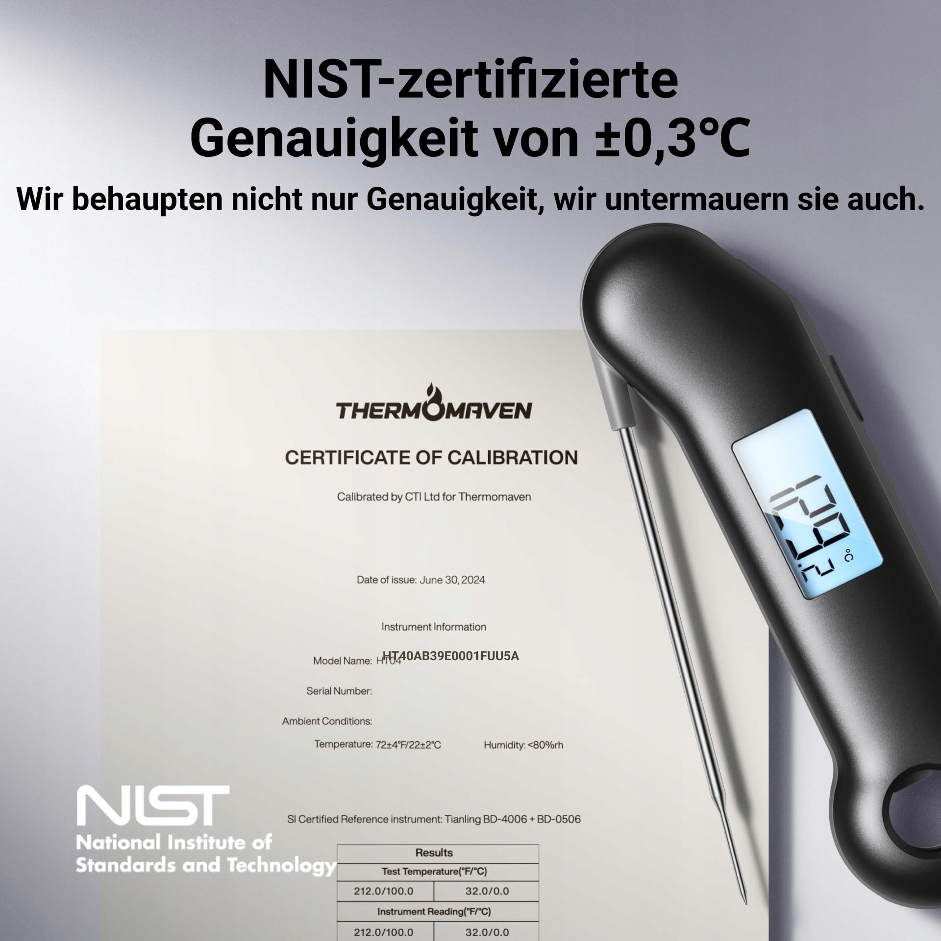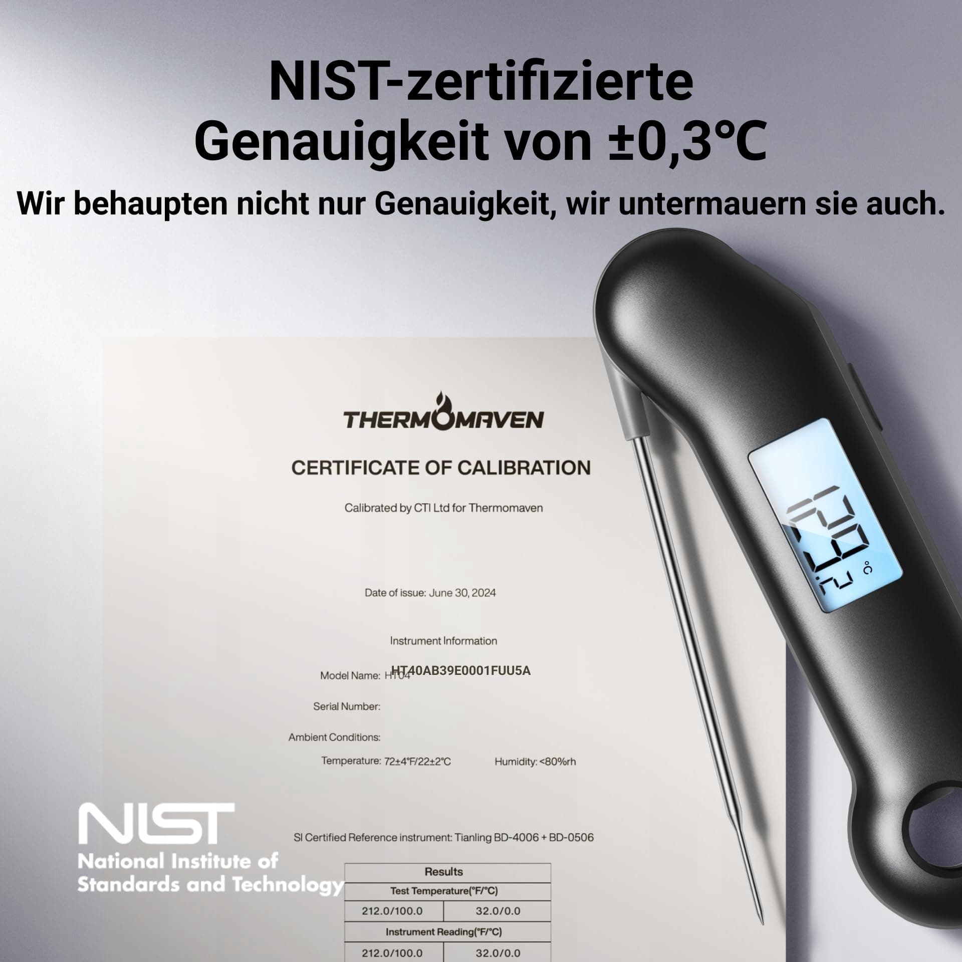 Certyfikowana dokładność: Oficjalnie certyfikowany przez NIST cyfrowy termometr do mięsa ThermoMaven zawsze oferuje dokładność ±0,3°C, dzięki czemu otrzymujesz precyzyjne wartości temperatury i możesz gotować mięso do pożądanego stopnia, nie przypalając go ani nie pozostawiając niedogotowanego. Może precyzyjnie mierzyć temperaturę w zakresie od -49,9 °C do 299,9 °C. Dodatkowo możesz przełączać się między ℃ a ℉.