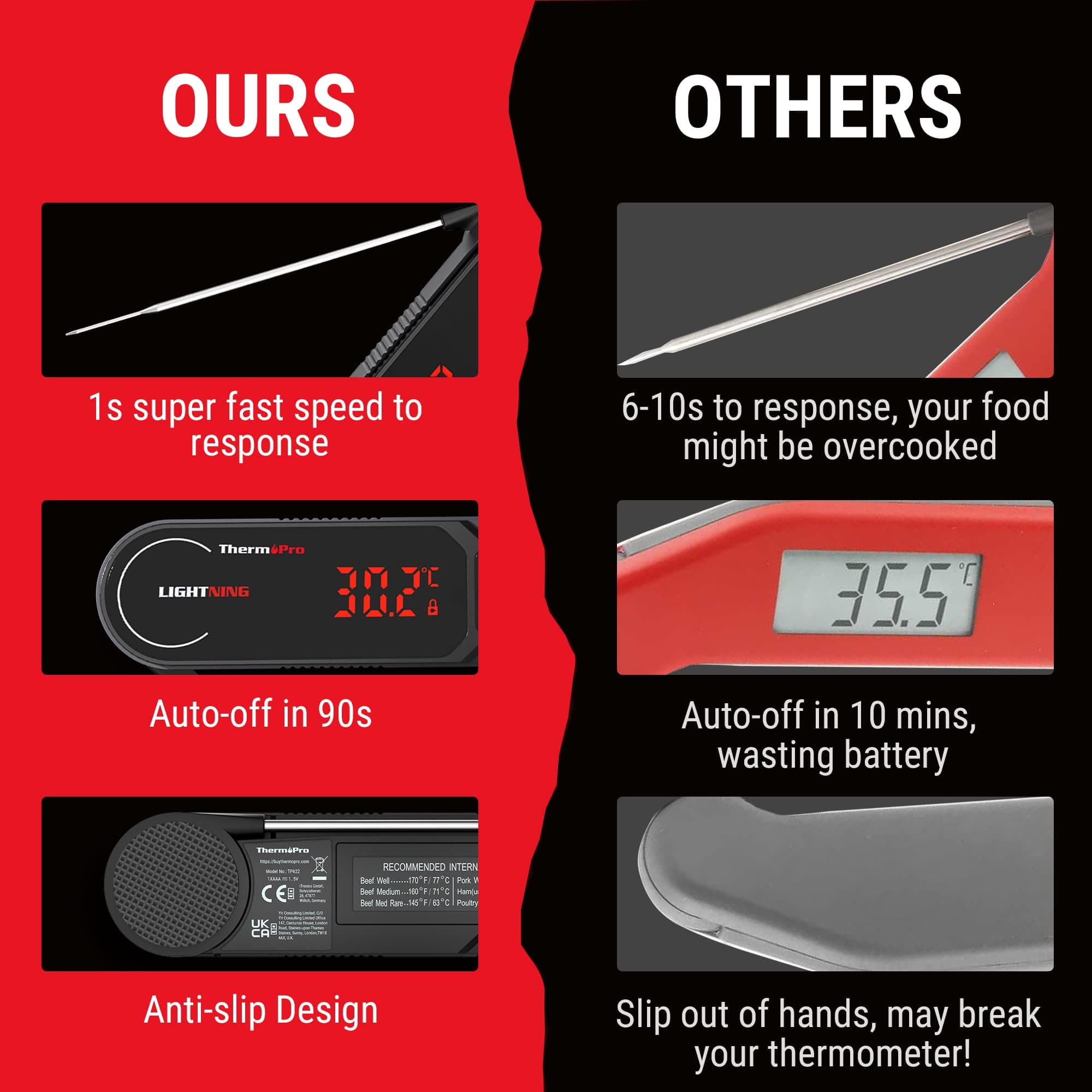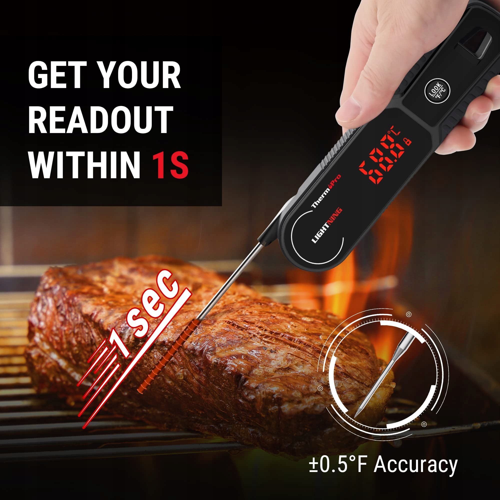 1s Szybki jak błyskawica: Dzięki profesjonalnemu czujnikowi termoelementowemu wynik pomiaru jest stabilnie wyświetlany po około 1 sekundzie, pozwól, aby potrawy z grilla były idealnie upieczone z tym termometrem do mięsa.