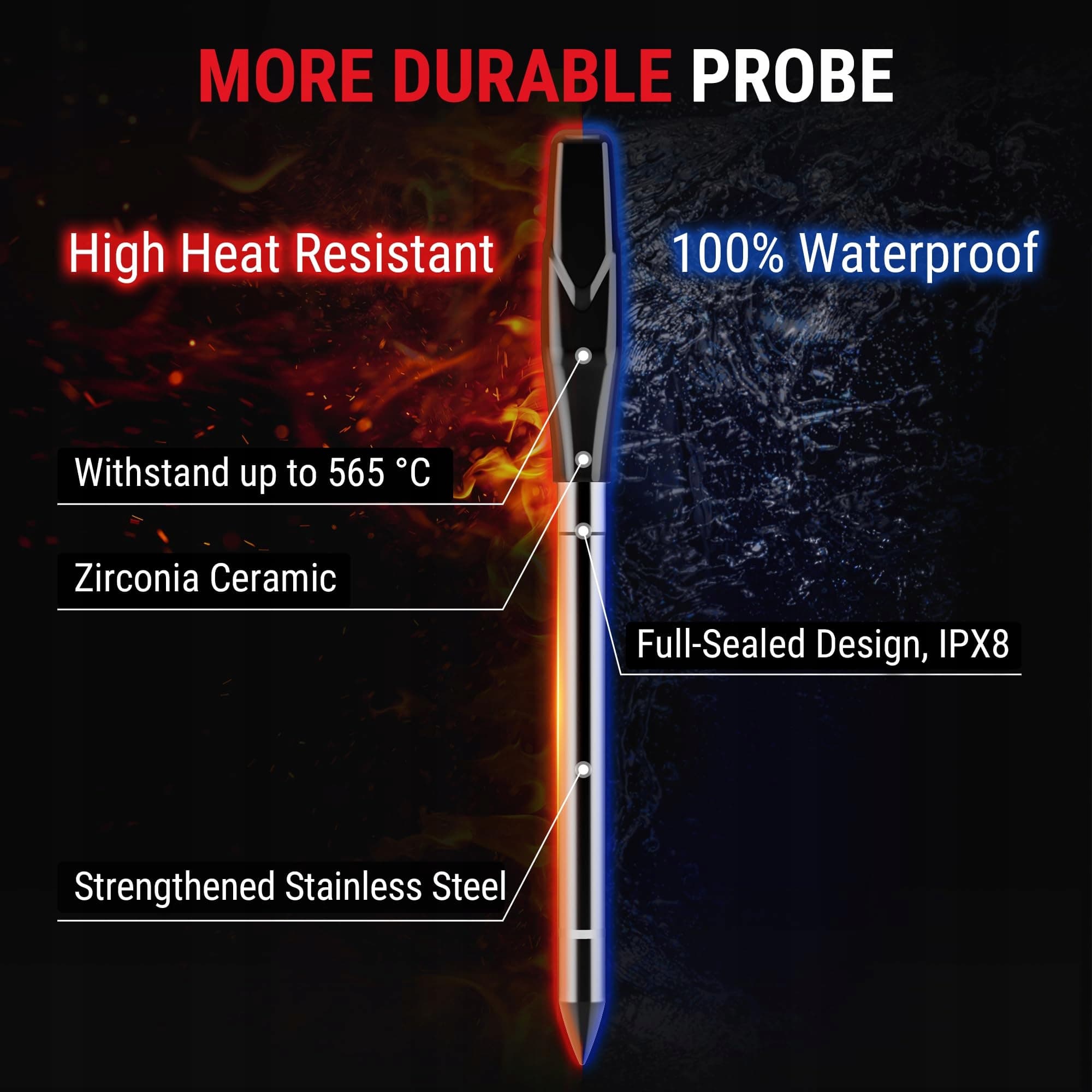 【100 % bezprzewodowa i wodoodporna sonda】Pożegnaj się z uciążliwymi kablami! Są łatwiejsze w użyciu i przechowywaniu, co sprawia, że są lepsze do rotacyjnego grilla niż inne termometry przewodowe. Klasa wodoodporności IPX8 sprawia, że produkt jest bezpieczniejszy przed uszkodzeniami wodnymi i skutecznie wydłuża jego żywotność