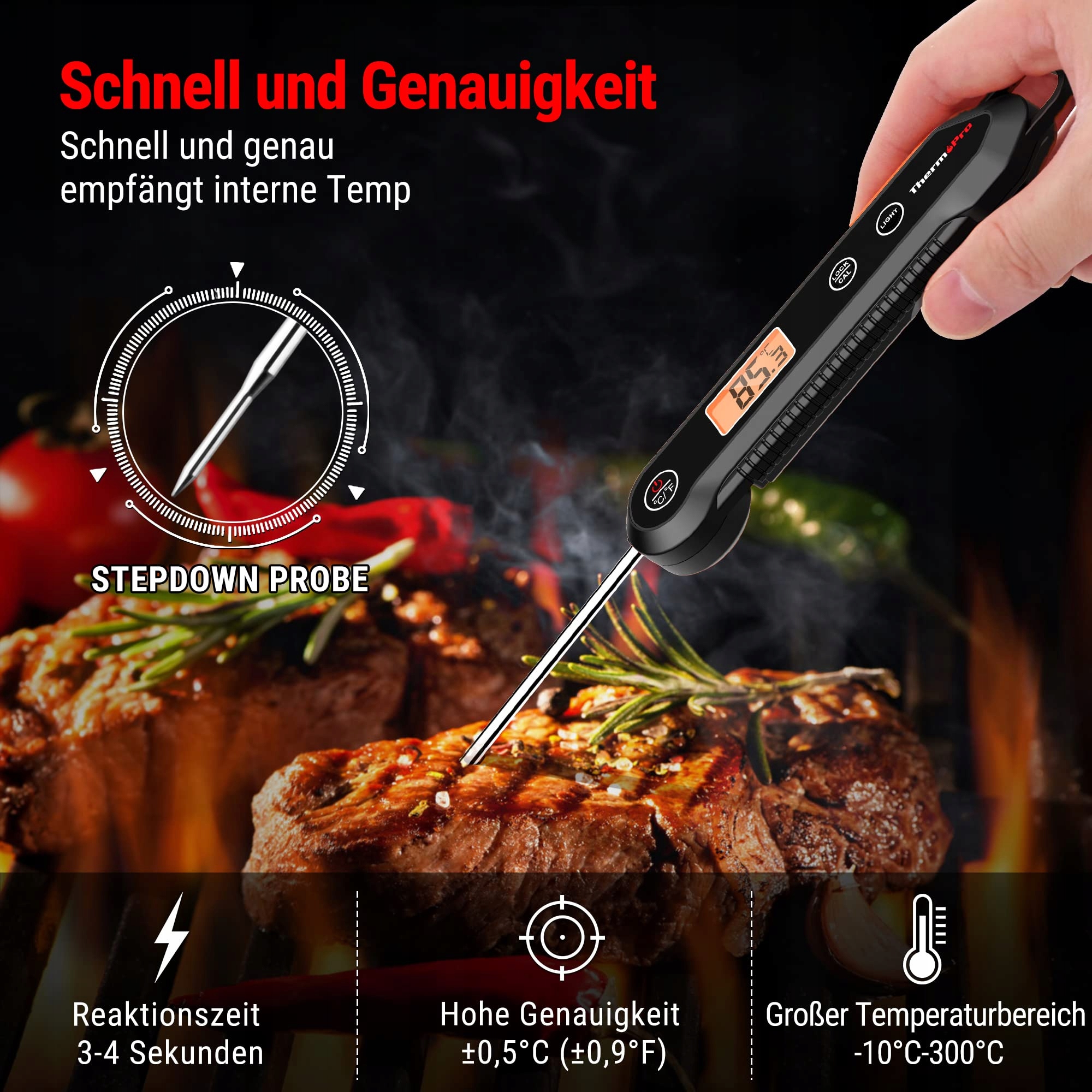 Szybki i precyzyjny: Dzięki wbudowanym wysokoprecyzyjnym czujnikom, poręczny termometr kuchenny dostarcza pomiary w ciągu 3-4s z odchyleniem 0.5 ℃. Zakres temperatur wynosi od -50°C do 300°C, co pozwala na użycie go zarówno do lodu, jak i piekarnika.