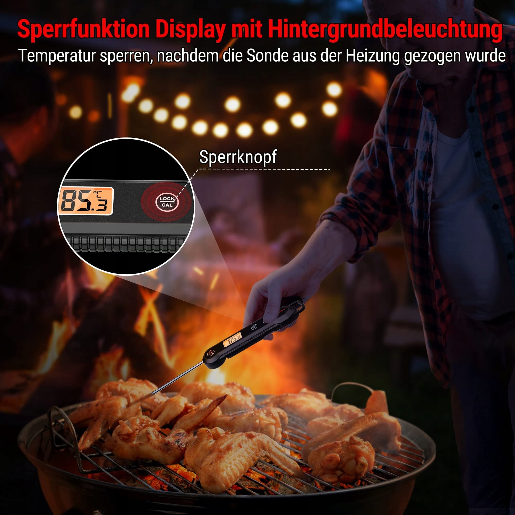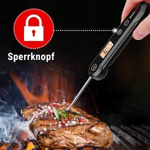 Kalibracja i funkcja blokady: Kalibracja zapewnia, że termometr grillowy przez dłuższy czas zachowuje dokładne pomiary. Funkcja blokady chroni przed poparzeniem, a pomiary temperatury są zamrażane.