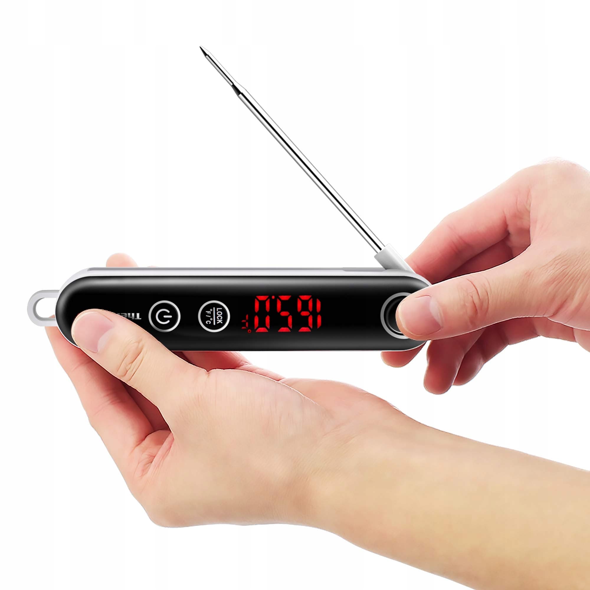 Łatwa obsługa: Termometr do pomiaru temperatury rdzenia automatycznie wyłącza się po 90 sekundach braku użycia, nie ma obaw o zużycie energii w trybie czuwania. Praktyczny mechanizm składania ułatwia pomiar temperatury rdzenia podczas grillowania lub smażenia pod każdym kątem.