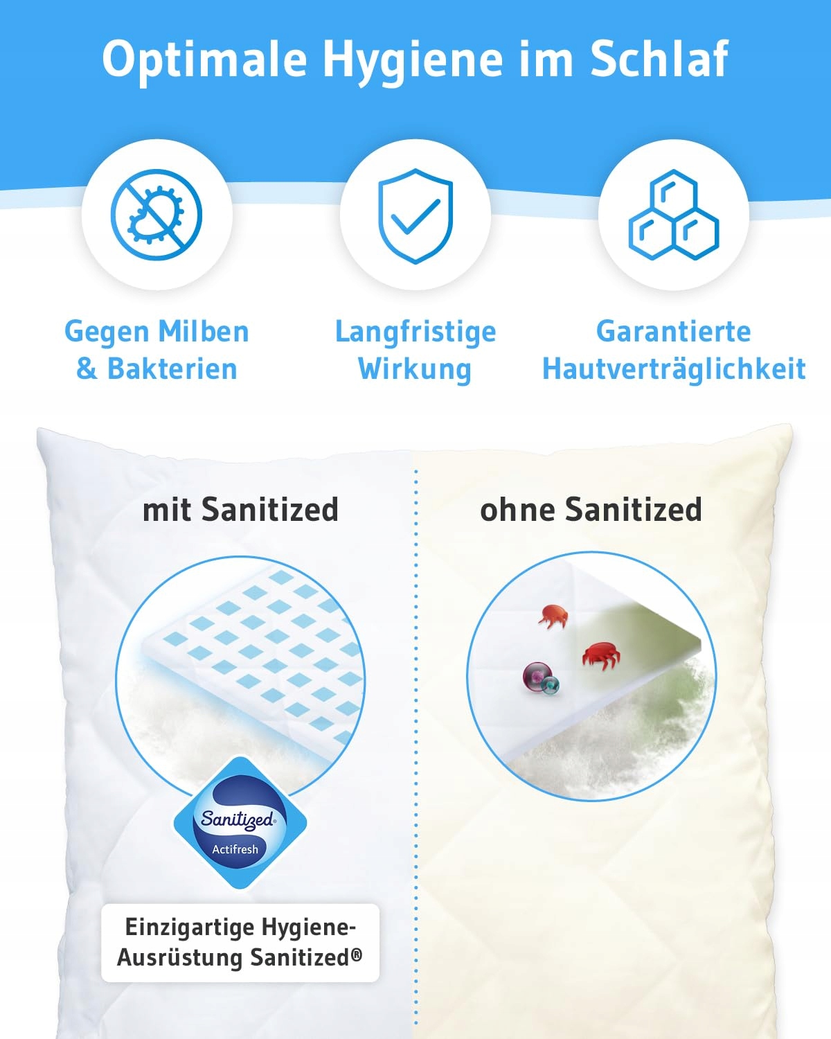 ➥ HIGIENICZNA ŚWIEŻOŚĆ – Poduszka do spania, którą można prać w 60°, jest wyposażona w opatentowaną technologię Sanitized, która skutecznie chroni przed bakteriami, pleśnią i roztoczami, co czyni ją idealną dla alergików i astmatyków. Ponadto poduszka posiada certyfikat STANDARD 100 by OEKO-TEX.