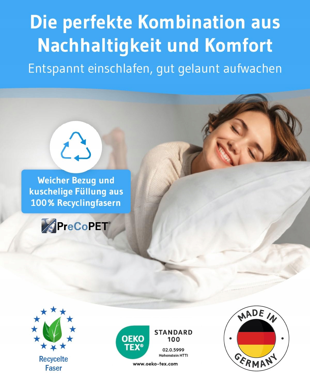 ➥ ZRÓWNOWAŻONY ROZWÓJ SPOTYKA KOMFORT – Wypełnienie PreCoPET z certyfikatem UE oraz poszewka wykonane są z recyklingowanych butelek PET i są wyjątkowo miękkie i puszyste – 100% zrównoważone dla lepszej przyszłości.