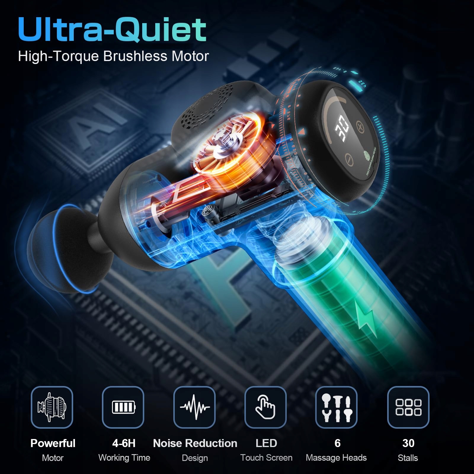 Pistolet do masażu mięśni, 30 poziomów prędkości, 6 głowic do masażu w celu złagodzenia bólu mięśni, modelowanie ciała z ekranem dotykowym LCD, głęboka czerń