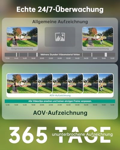 【AOV 24/7 Nagrywanie non-stop】Ta kamera zewnętrzna z kartą SIM posiada funkcję Always-On-Video (AOV) i nagrywa przez całą dobę. Przy braku ruchu nagrywa z prędkością 3 klatek na sekundę. Gdy wykryje zdarzenie i zostanie uruchomiony alarm, nagrywanie rozpoczyna się natychmiast z prędkością 25 klatek na sekundę, aby nie przegapić żadnej chwili. Sama kamera zużywa bardzo mało energii i jest wyposażona w wydajny akumulator 12000 mAh oraz panel słoneczny 7,5W. Dzięki temu nie musisz martwić się o rozładowanie akumulatora podczas całodziennego nagrywania i możesz nieprzerwanie monitorować otoczenie nawet w miejscach bez dostępu do prądu.