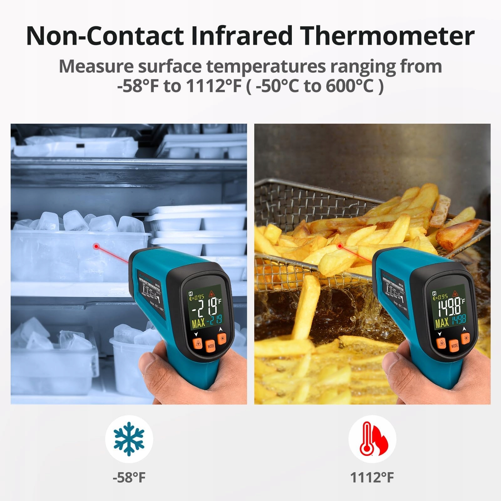 【Szerszy zakres pomiarowy】 Z zakresem pomiarowym od -50 °C do 600 °C / -58°F do 1112°F, termometr na podczerwień Tilswall może łatwo mierzyć temperaturę powierzchni codziennych i przemysłowych obiektów, takich jak żywność, szkło, stal itp. (Uwaga: Proszę nie używać termometru dla ludzi lub zwierząt.)