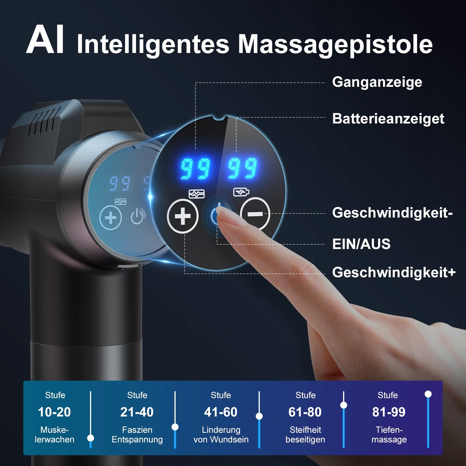 【Inteligentny pistolet do masażu AI】Pistolet do masażu inteligentnie dostosowuje intensywność, opierając się na danych zwrotnych z uderzeń, dzięki czemu każdy masaż jest dokładnie odpowiedni. Urządzenie do masażu wyposażone jest w inteligentny i wrażliwy ekran dotykowy LED, który wyświetla poziom prędkości i wskaźnik mocy.