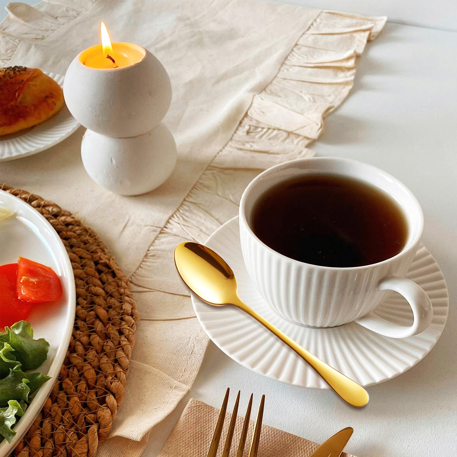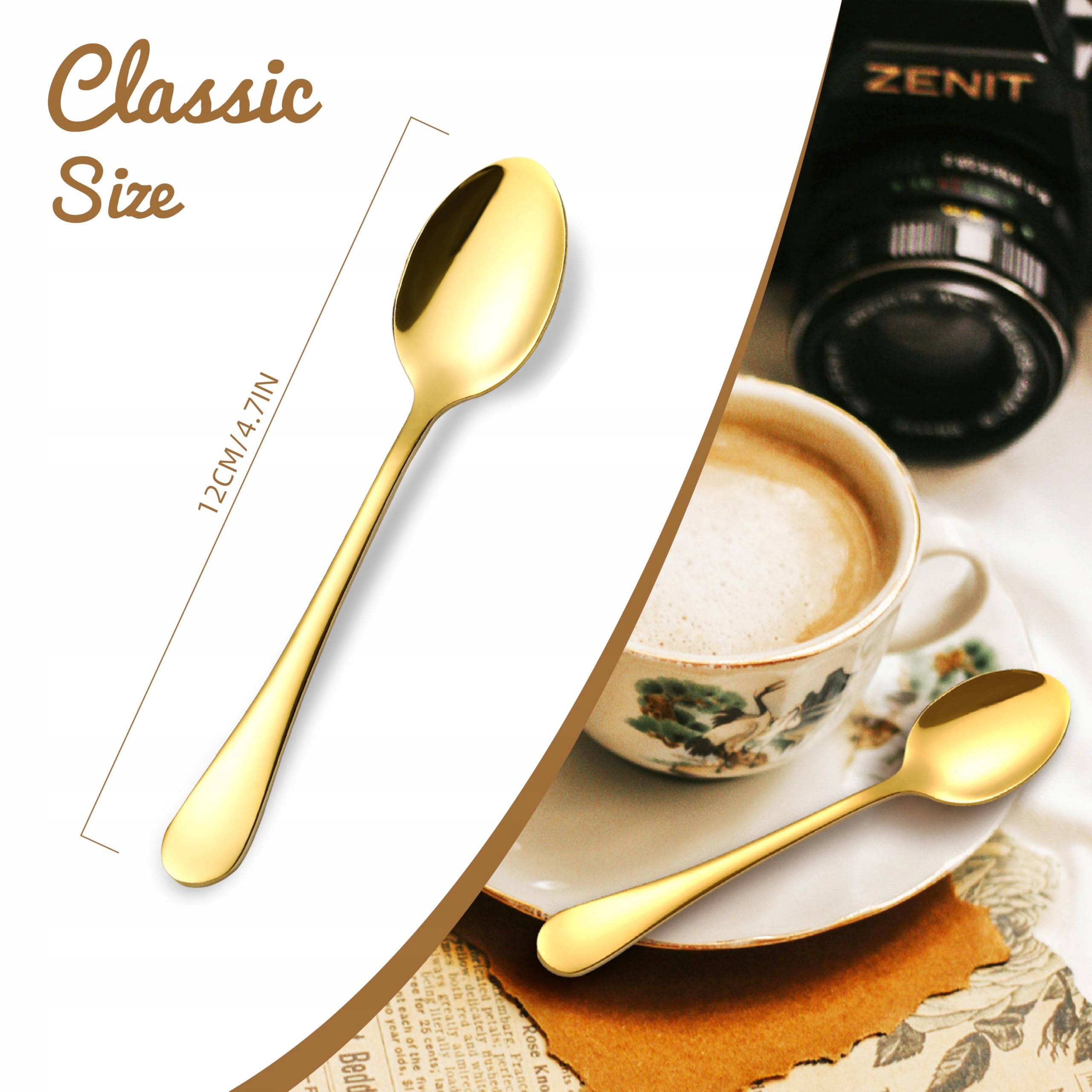 【Klasyczny i ergonomiczny design】Kute i pogrubione uchwyty pozwalają wygodnie i stabilnie trzymać łyżeczki w dłoni. Polerowane na lustro i gładkie, dzięki czemu powierzchnia łyżeczki błyszczy i wygląda elegancko na zwykłej filiżance do kawy. Prosty wygląd bez zbędnych ozdób, klasyczny design pasujący do każdego stylu naczyń kuchennych.