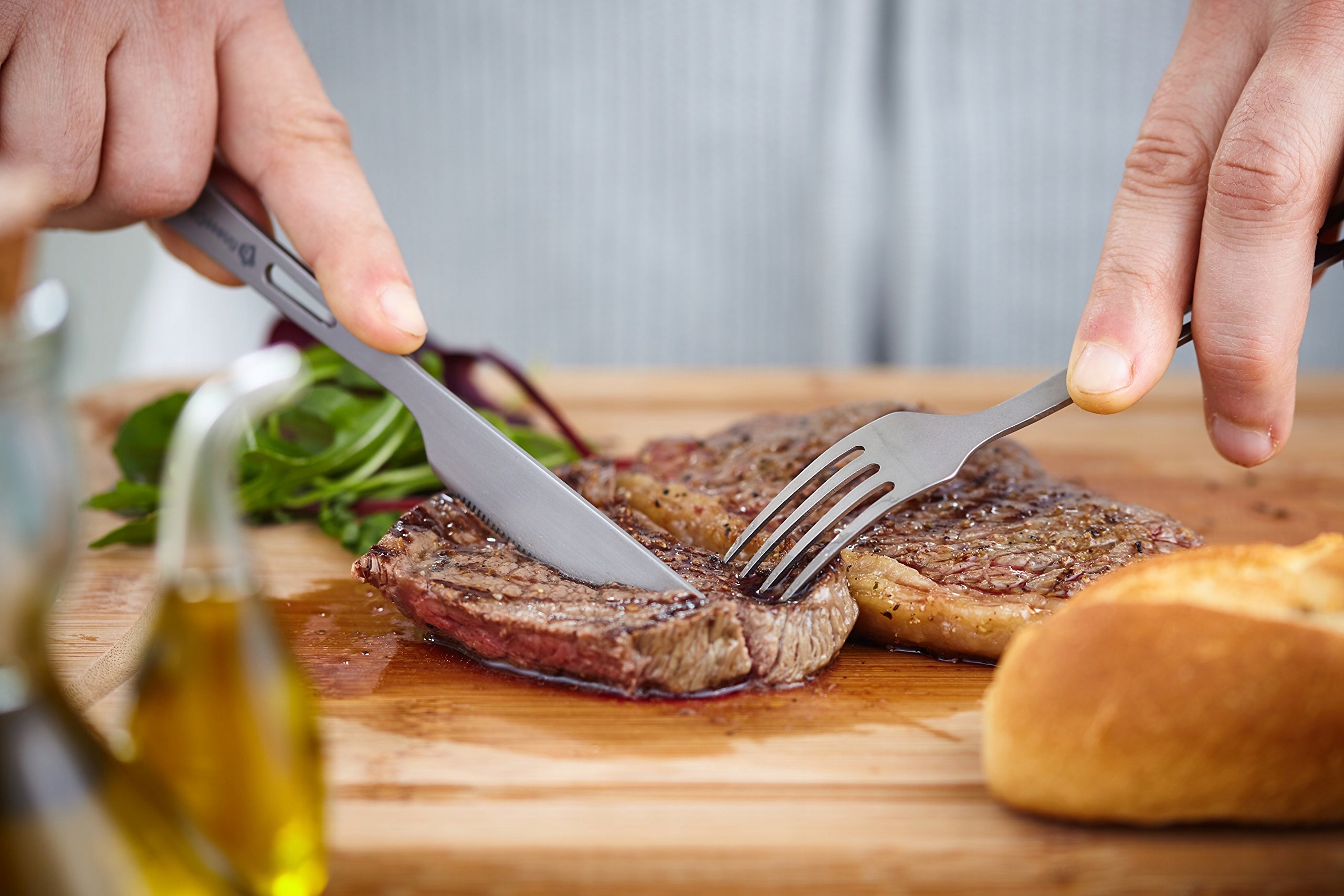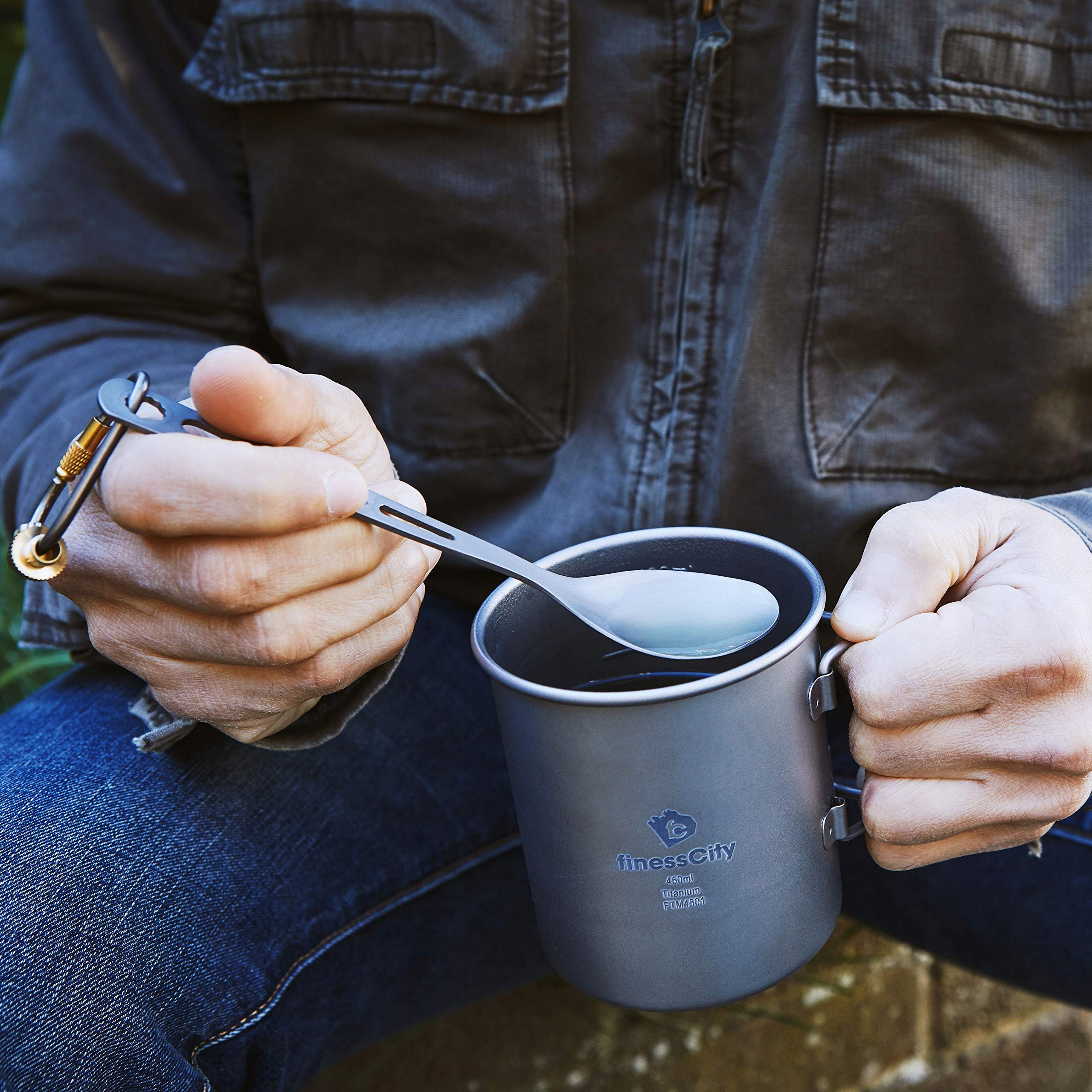 SUPER WYTRZYMAŁY I ULTRALEKKI: zestaw sztućców finessCity z czystego tytanu, 3-częściowy, jest bardzo solidny, lekki i łatwy w użyciu. Wykonany jest w 100% z tytanu, a cały zestaw waży tylko 50 g. W tym zestawie kempingowym otrzymujesz nóż, łyżkę i widelec. Wymiary NOWEGO ULEPSZONEGO noża to 18,3 cm, łyżki 16 cm i widelca 16,5 cm, a każdy element waży 15 g. Zestaw wyposażony jest w karabińczyk, dzięki czemu możesz go używać jako breloczka lub do zawieszenia