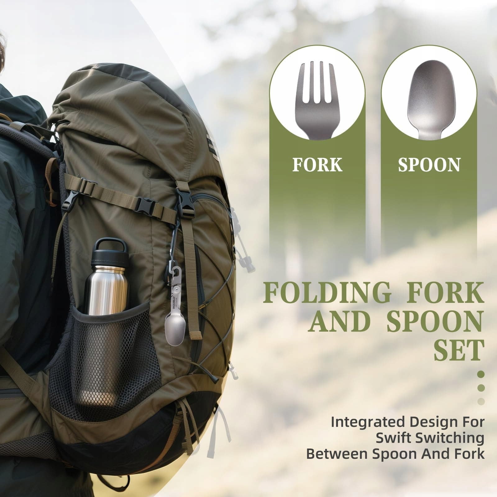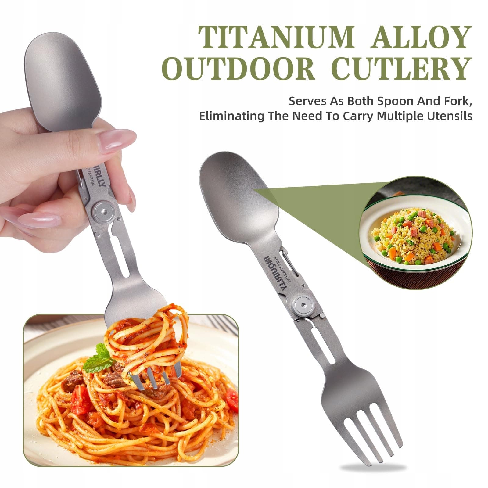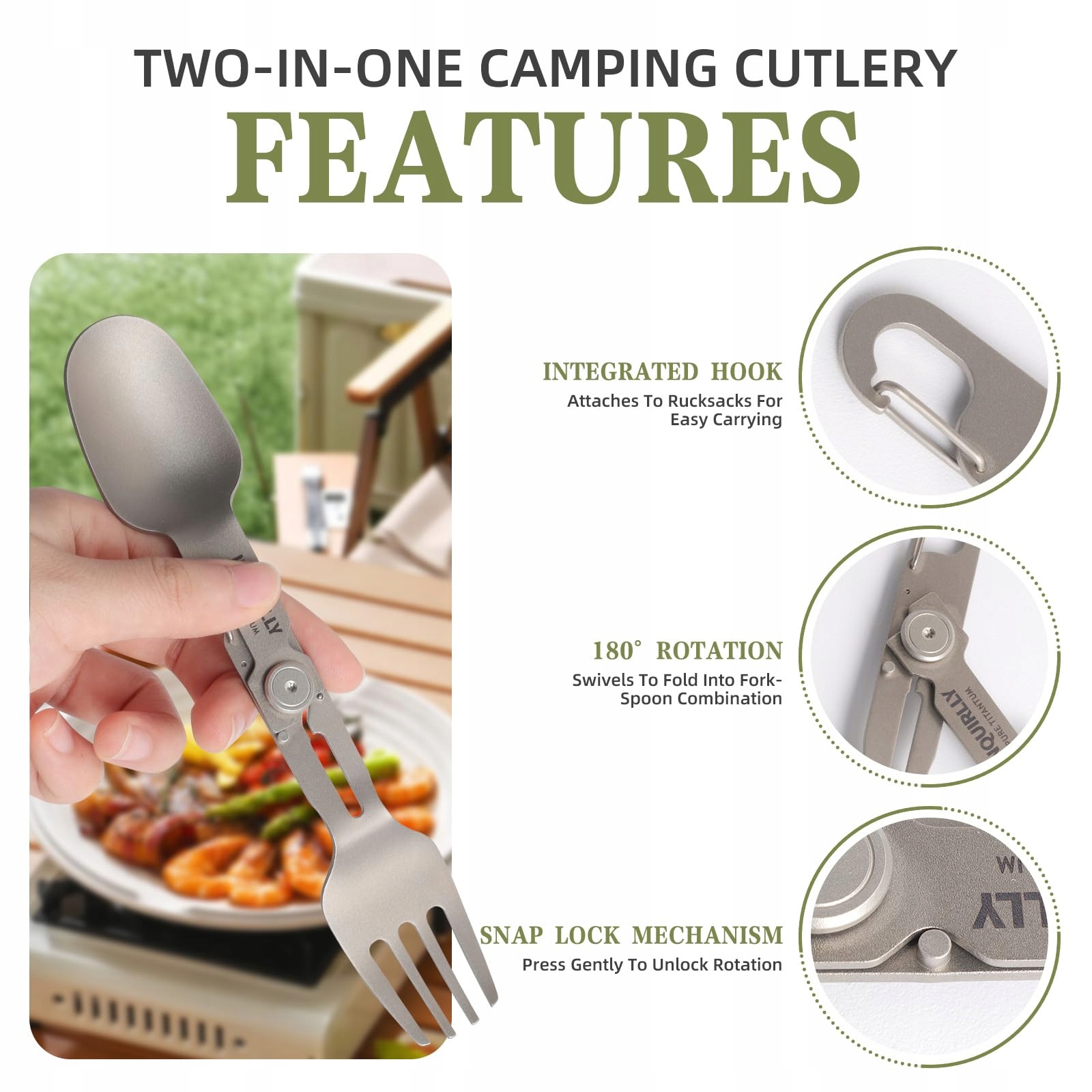 【2-w-1 Zestaw sztućców kempingowych】: multitool składany zestaw sztućców z praktycznym mechanizmem blokującym do szybkiego przełączania między łyżką a widelcem. Dzięki zintegrowanemu designowi nie trzeba nosić ze sobą kilku oddzielnych przyborów