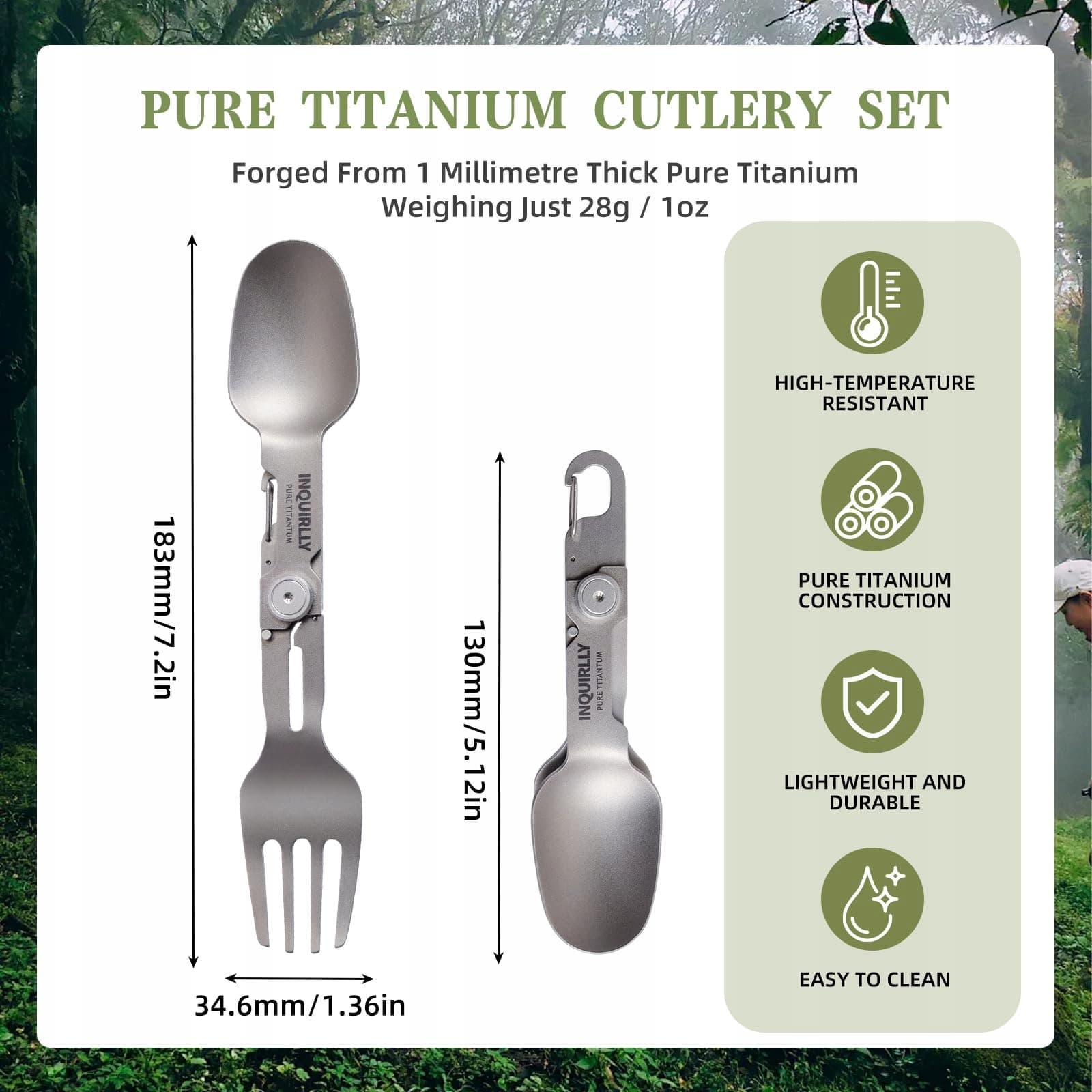 【Sztućce z czystego tytanu】: składana łyżka i widelec wykonane z 1 mm grubego czystego tytanu, łączą wysoką wytrzymałość z trwałością. O długości 18,2 cm są dłuższe niż tradycyjne składane łyżki i wyjątkowo lekkie, ważąc zaledwie 28 g