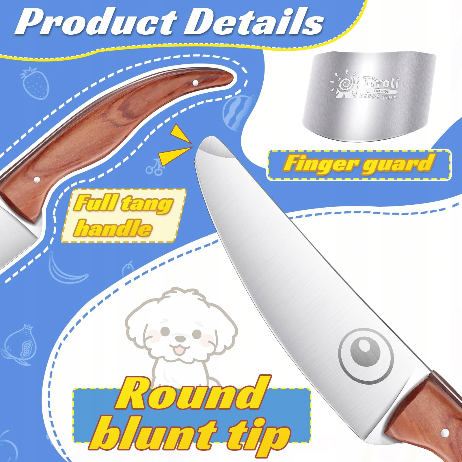Przyjazny dla dzieci design: Osłona na palce chroni palce dzieci przed niebezpieczeństwami. Każdy mały nóż ma zaokrąglony, tępy czubek, który zapobiega przypadkowemu ukłuciu. Ząbkowane ostrze jest łatwiejsze do chwytania żywności, nie łatwo się ślizga, zapewniając dzieciom niezbędne bezpieczeństwo. Wymagana jest nadzór rodzicielski.
