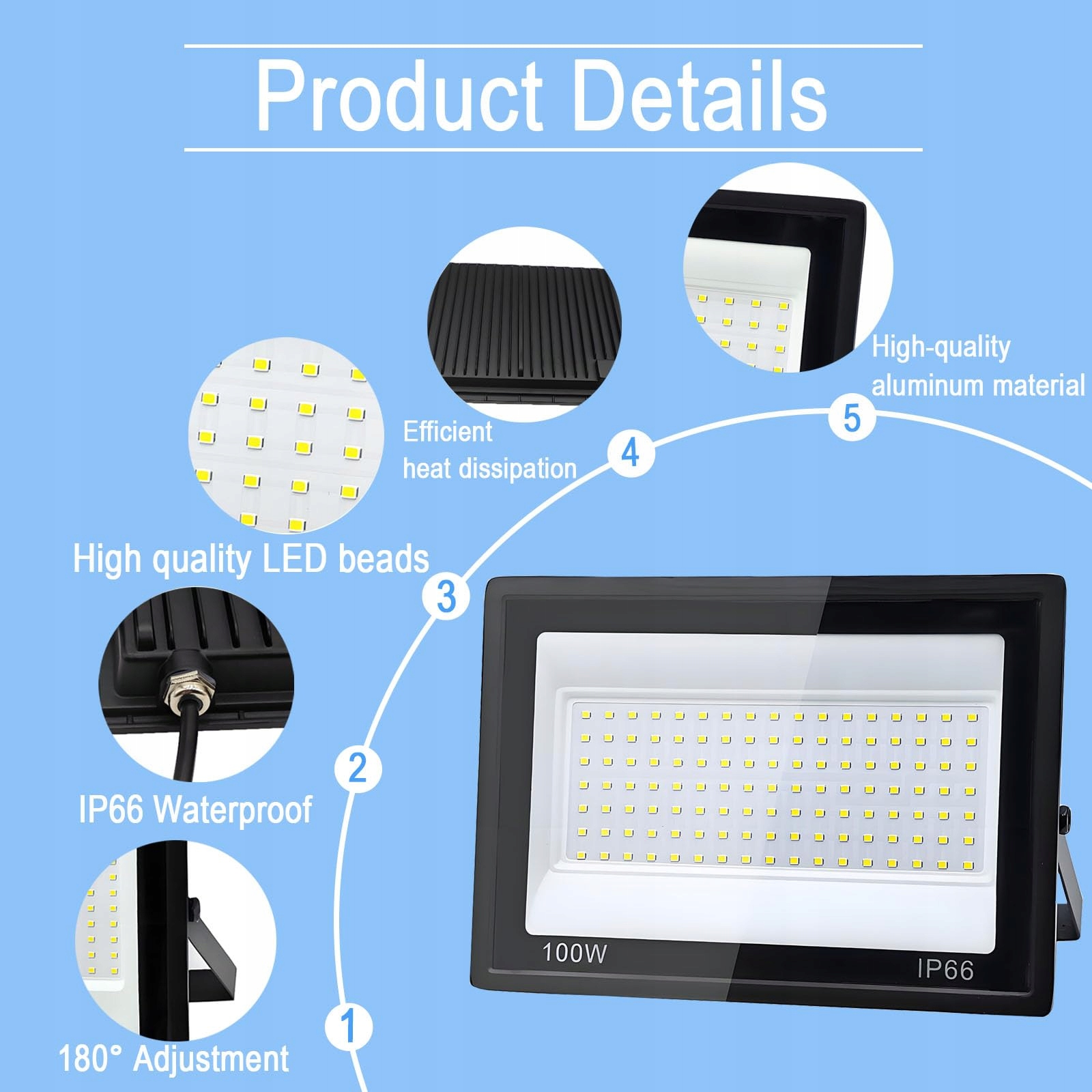 【Wodoodporny IP66】 Reflektor LED zewnętrzny wykonany jest z materiału wodoodpornego IP66, odporny na kurz i wodę. Wodoodporność lampy zewnętrznej została podniesiona do IP66, dzięki czemu jest odporna na wilgoć i kurz. Niezależnie od deszczu, śniegu, upału czy mrozu, lampa zewnętrzna może być bezpiecznie i niezawodnie używana na zewnątrz.