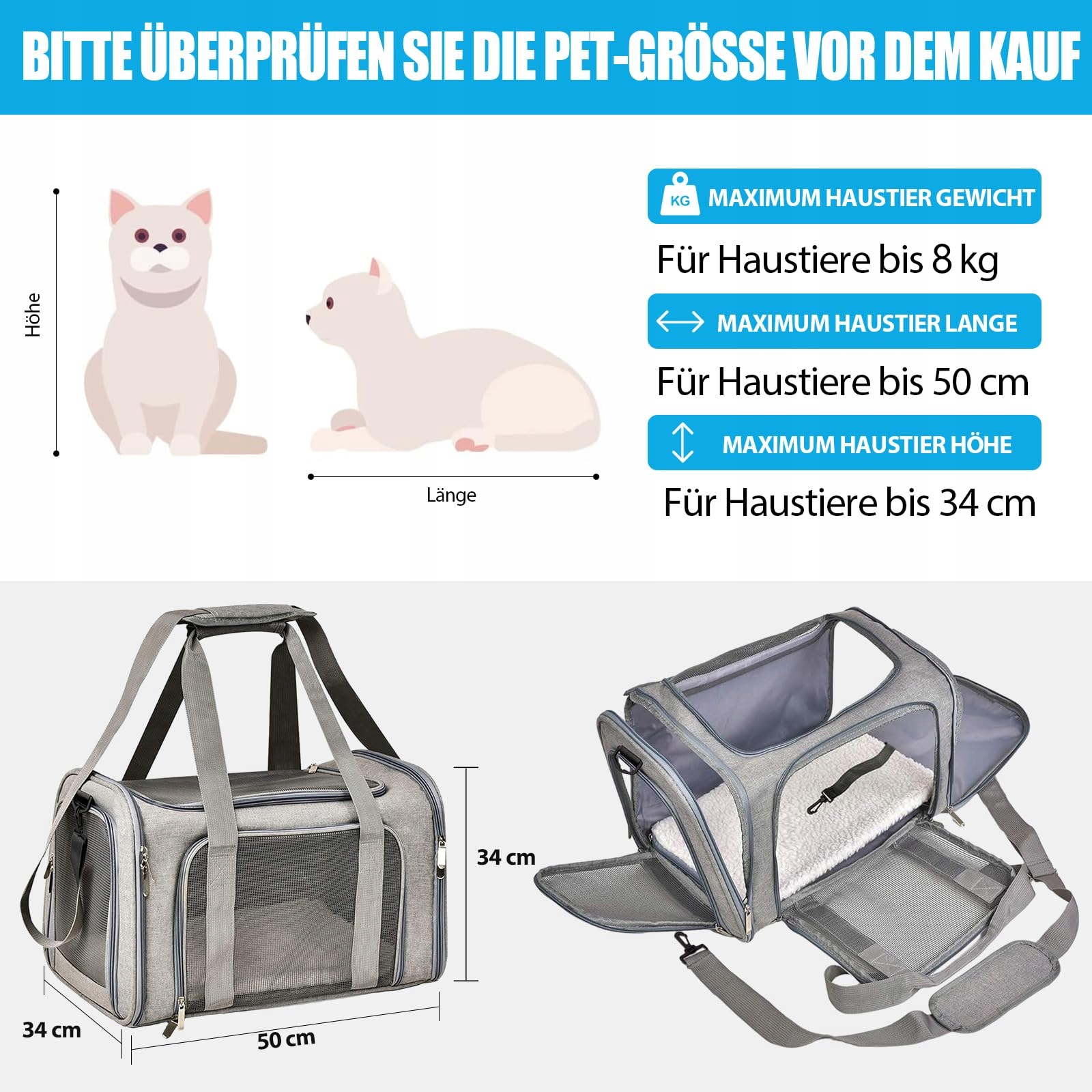 TOFFCAEA Torba transportowa dla kota i psa, transporter dla psa, składany transporter dla kota, przenośny, 5kg nosidełko dla kotów i psów, dla średnich psów, kotów (Szary, L 50 x B 34 x H 34 cm)
