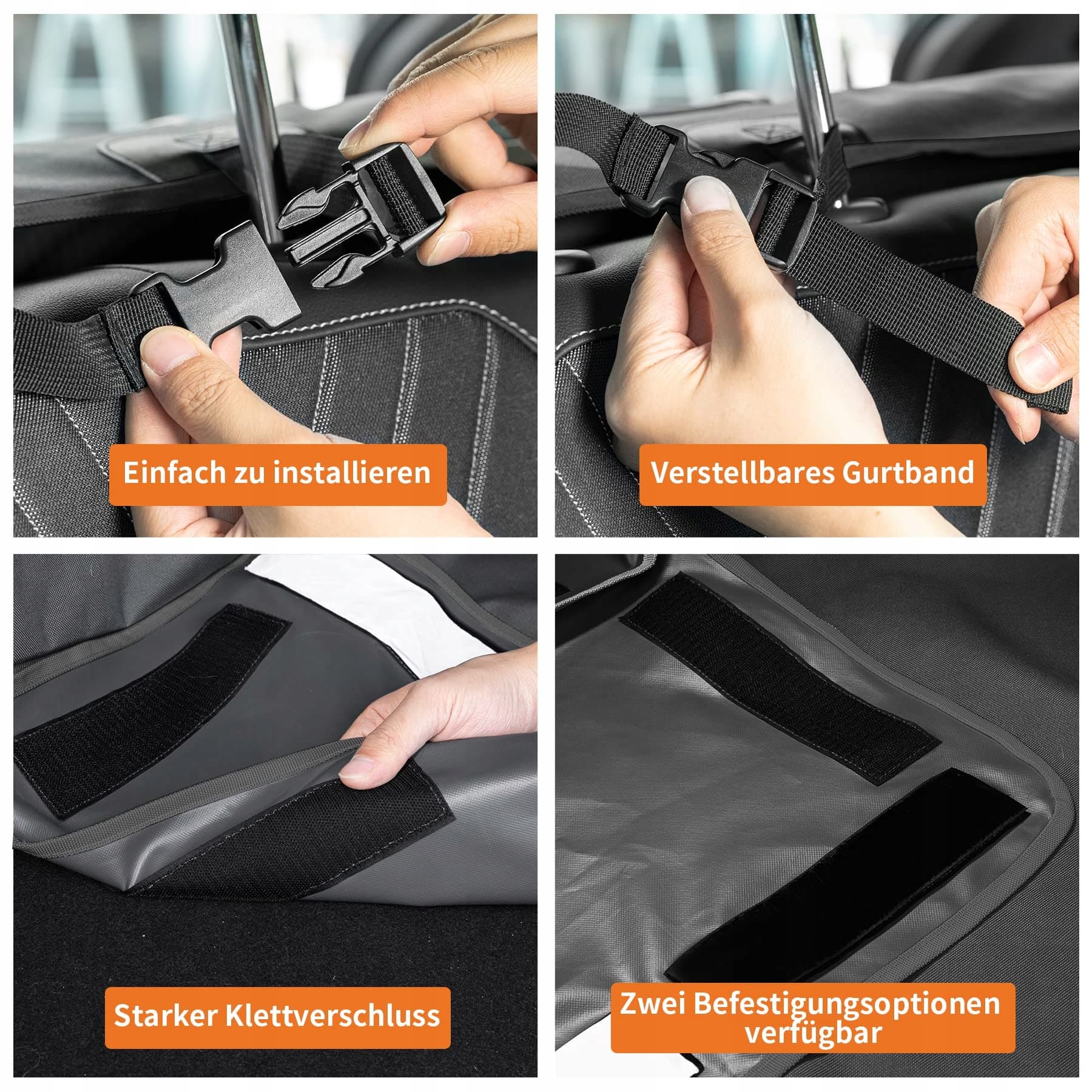 SZYBKI I STABILNY MONTAŻ - 10 rzepów i 2 zatrzaski na zagłówkach zapewniają stabilne mocowanie. Osłonę bagażnika można łatwo zamontować i zdjąć w ciągu minuty.