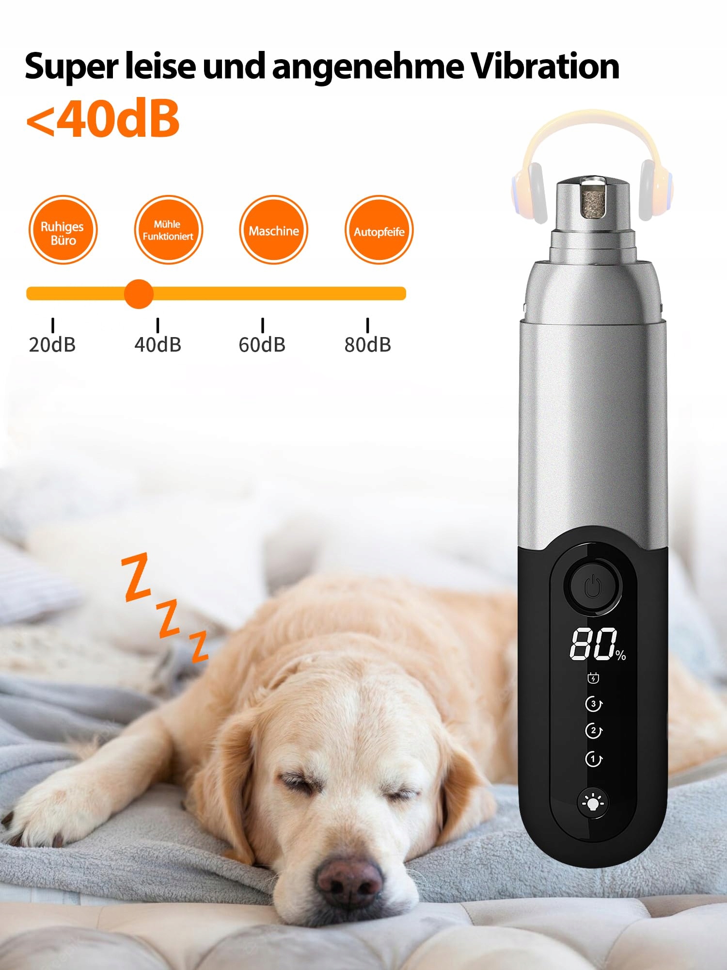 Cicha: Profesjonalna elektryczna szlifierka do pazurów dla psów generuje hałas poniżej 40 dB, aby uczynić cięcie pazurów zwierząt spokojniejszym i bardziej komfortowym, unikając lęku i stresu.