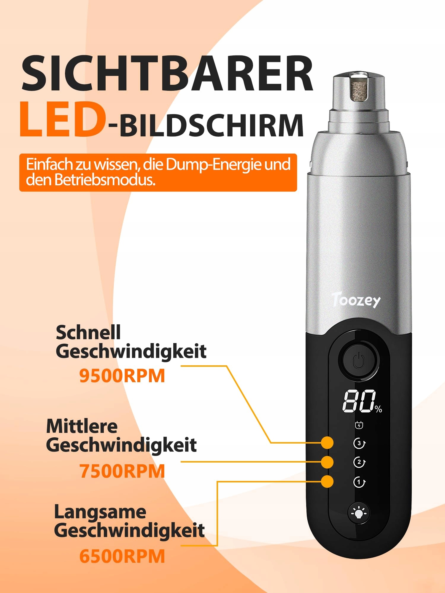 Toozey szlifierka do pazurów dla psów, nożyczki do pazurów z 4 diodami LED, super cicha (40 dB), 3 prędkości, długi czas pracy na baterii 7,5 godziny, USB ładowalna szlifierka do pazurów dla kotów