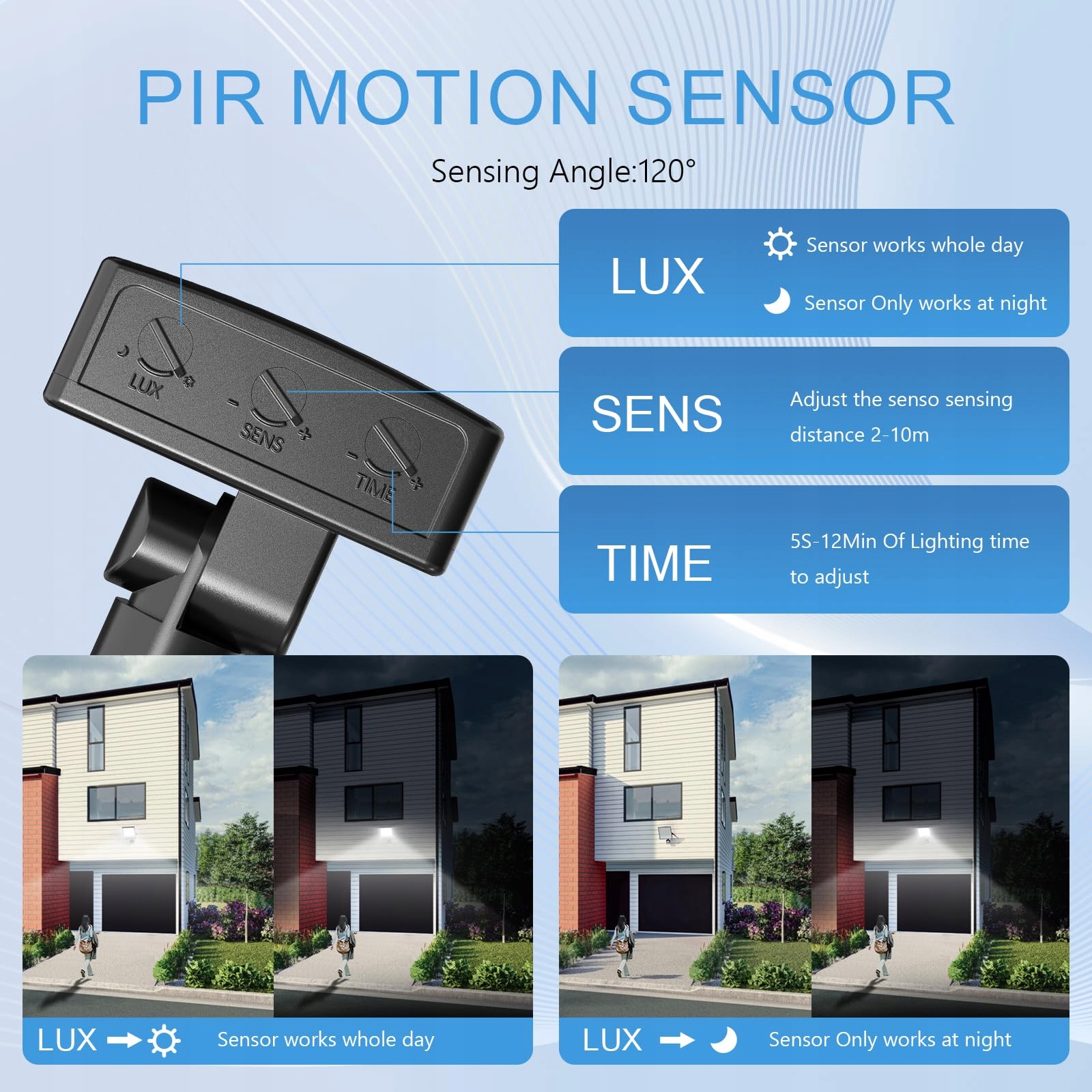 Reflektor LED z czujnikiem ruchu na zewnątrz 100W: Ten reflektor LED z czujnikiem ruchu posiada wysoce czuły, regulowany kątowo czujnik ruchu PIR, który można ustawić w trzech trybach: TIME (regulowany czas świecenia od 5 s do 12 min), SENS (regulowany zasięg czujnika od 2 do 10 m), LUX (czujnik działa przez całą dobę lub tylko w nocy).