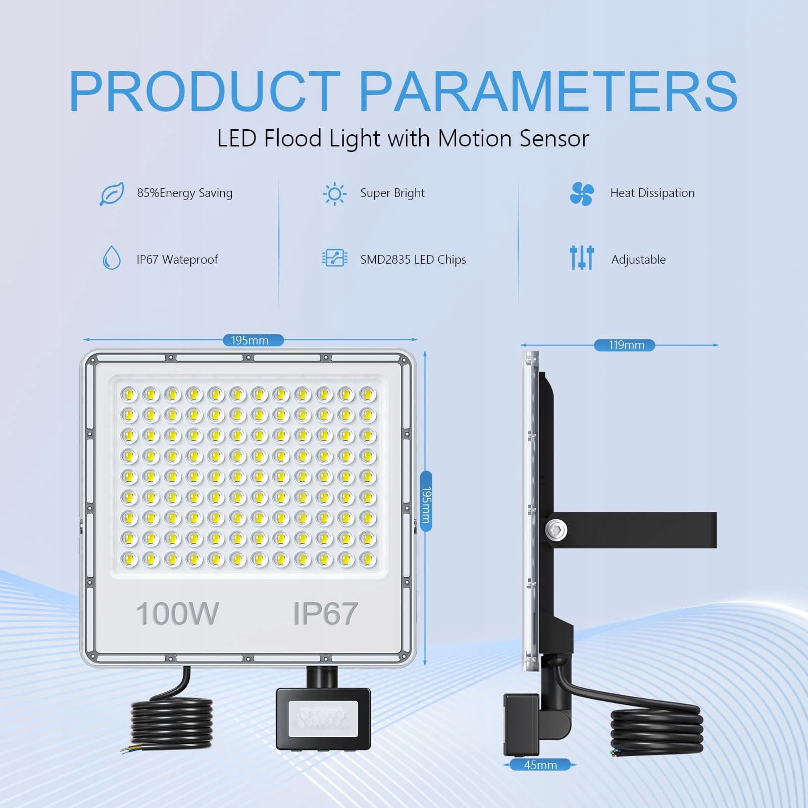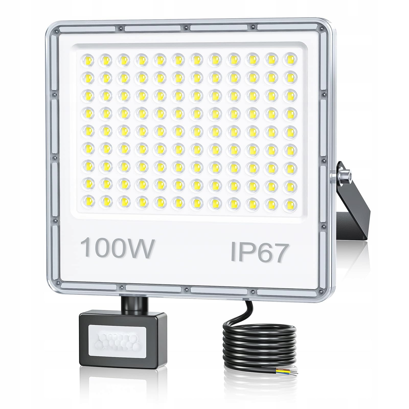 TOPAUBUB Reflektor LED na zewnątrz z czujnikiem ruchu: Ten 100 W 10000 LM 6500 K zimnobiały reflektor LED z czujnikiem ruchu na zewnątrz działa na napięciu 220~240 V. W porównaniu z tradycyjnymi lampami halogenowymi możesz zaoszczędzić 85% kosztów energii i cieszyć się oświetleniem bez obaw o wysokie rachunki za prąd.