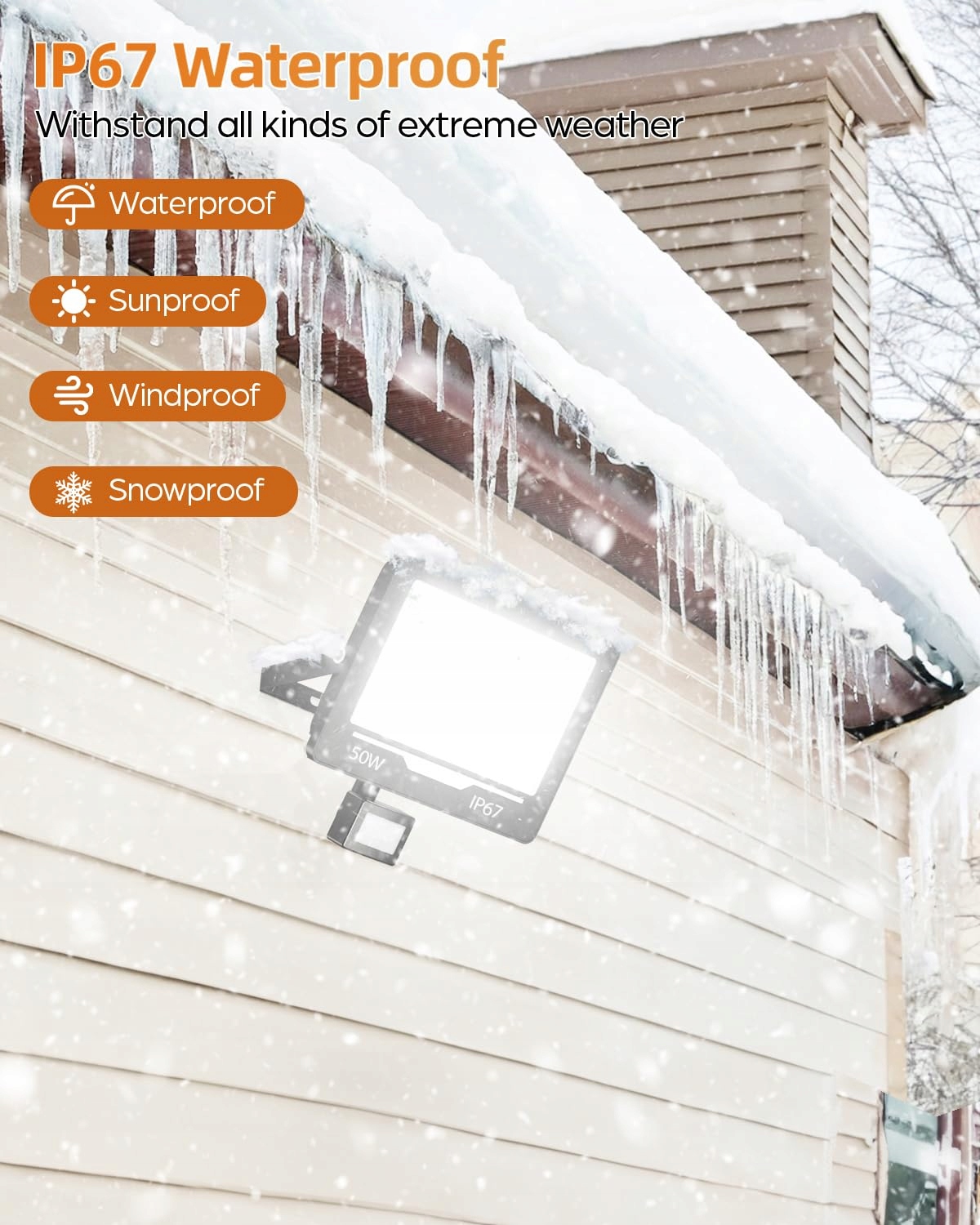 Reflektor zewnętrzny IP67 z czujnikiem ruchu: Ten reflektor LED na zewnątrz z czujnikiem ruchu jest wytrzymały do użytku zewnętrznego i posiada klasę ochrony IP67 zapewniającą ochronę przed wodą i kurzem. Solidna obudowa z aluminium ze szkłem hartowanym skutecznie odporna na deszcz, śnieg, kurz i zachlapania ze wszystkich stron, gwarantując stałą wydajność przez cały rok w każdych warunkach pogodowych.