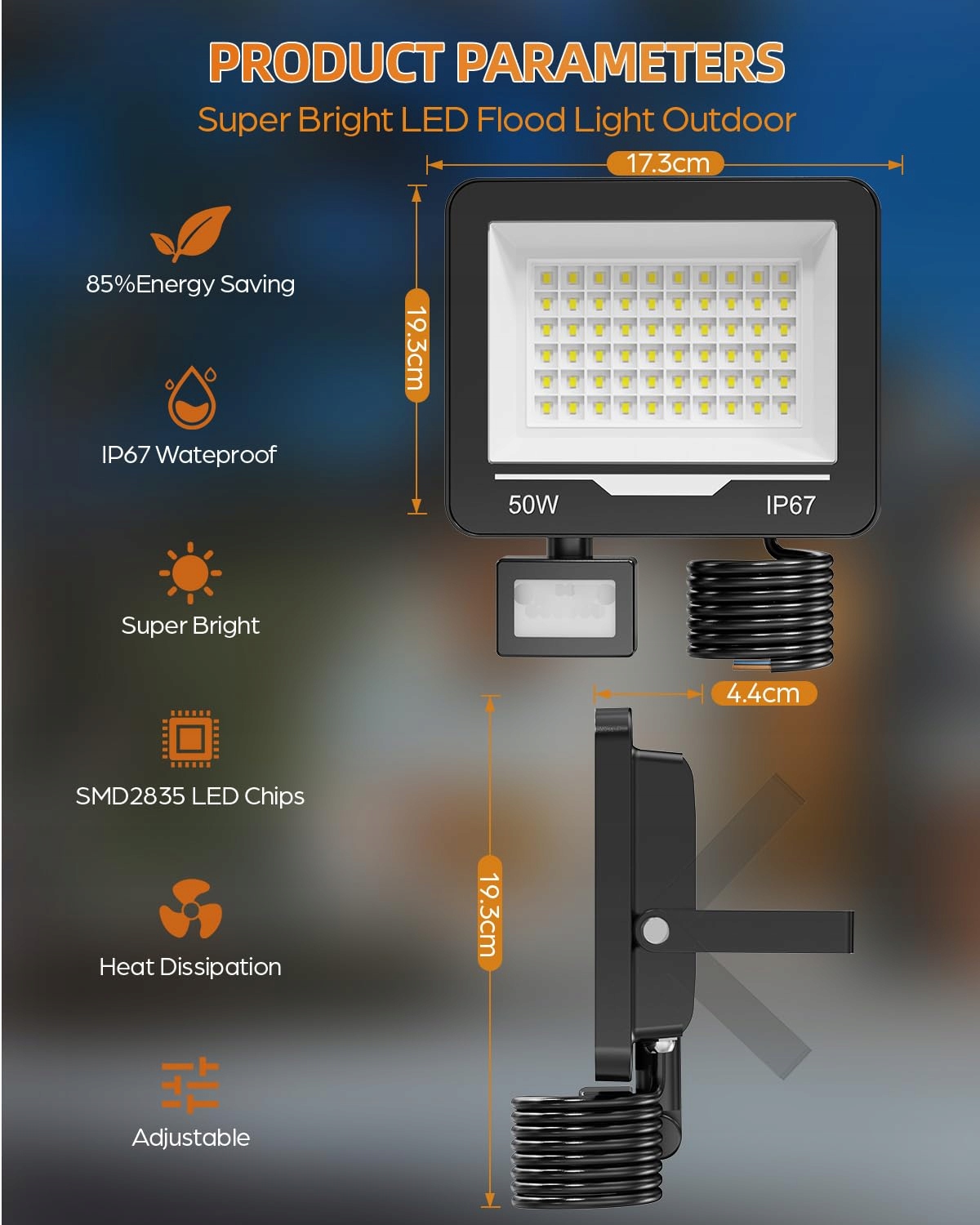 Instrukcja montażu LED z czujnikiem ruchu: Reflektor z czujnikiem ruchu wyposażony jest w obszerny przewód zasilający o długości 50 cm oraz regulowany o 180° uchwyt montażowy, który zapewnia wystarczający zasięg do łatwego podłączenia. Szerokie zastosowanie, odpowiedni do tarasów, dziedzińców, ogrodów, parków, basenów, fabryk, magazynów, hal sportowych, oświetlenia awaryjnego itp.