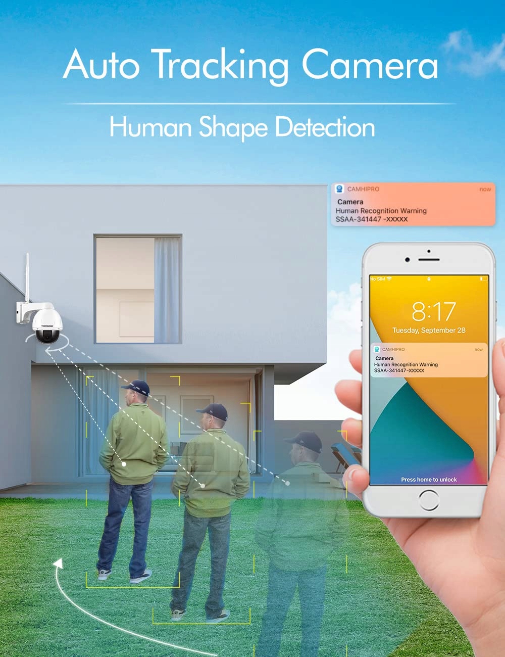 [Wykrywanie humanoidalne i alarm syreny]: Kamera bezpieczeństwa z funkcją panoramy i pochylenia posiada dwa tryby wyzwalania alarmu: wykrywanie ruchu i wykrywanie humanoidalne. Gdy obie funkcje są połączone, skutecznie filtruje zakłócenia spowodowane przez zwierzęta, pojazdy oraz deszcz i śnieg (co prowadzi do fałszywych alarmów).