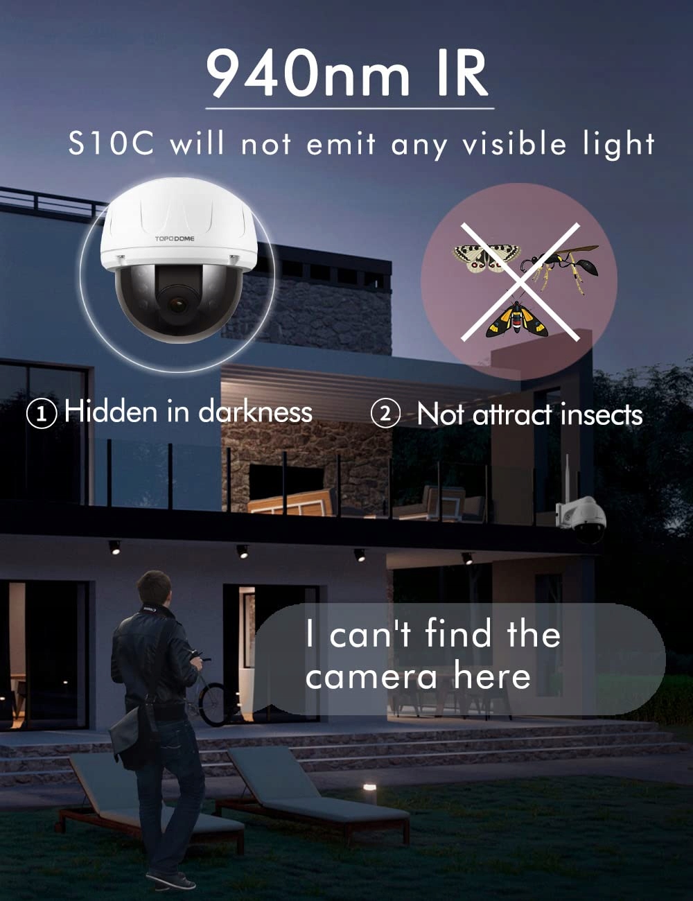 Topodome 5MP Kamera do monitoringu zewnętrznego 940nm IR, Bezprzewodowa kamera IP WLAN na zewnątrz, PT 355°/90°, Wykrywanie osób i automatyczne śledzenie, dwukierunkowe audio, wbudowana karta microSD 32G, syrena, IP66