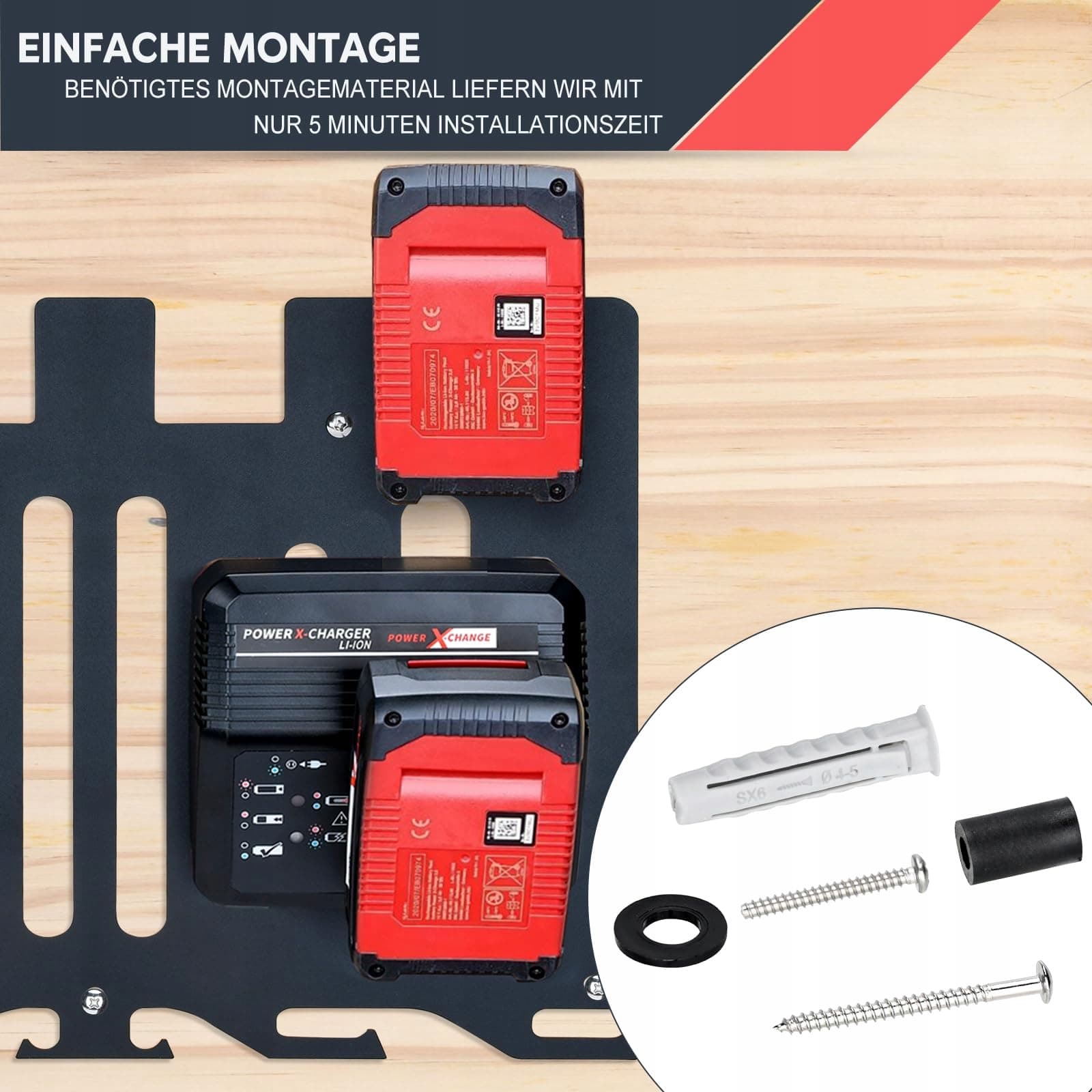 【UCHWYT NA AKUMULATOR I WIESZAK】 3-w-1 wielofunkcyjny uchwyt ścienny na akumulatory, ładowarki i wkrętarki akumulatorowe. Ten uchwyt ścienny jest idealny dla wszystkich akumulatorów Einhell Power-X-Change 18V, można łatwo zamontować do czterech akumulatorów. Ponadto wieszaki na dole są przeznaczone na wiertarki akumulatorowe, miarki i inne narzędzia, które można zawiesić, aby lepiej zorganizować warsztat i garaż.
