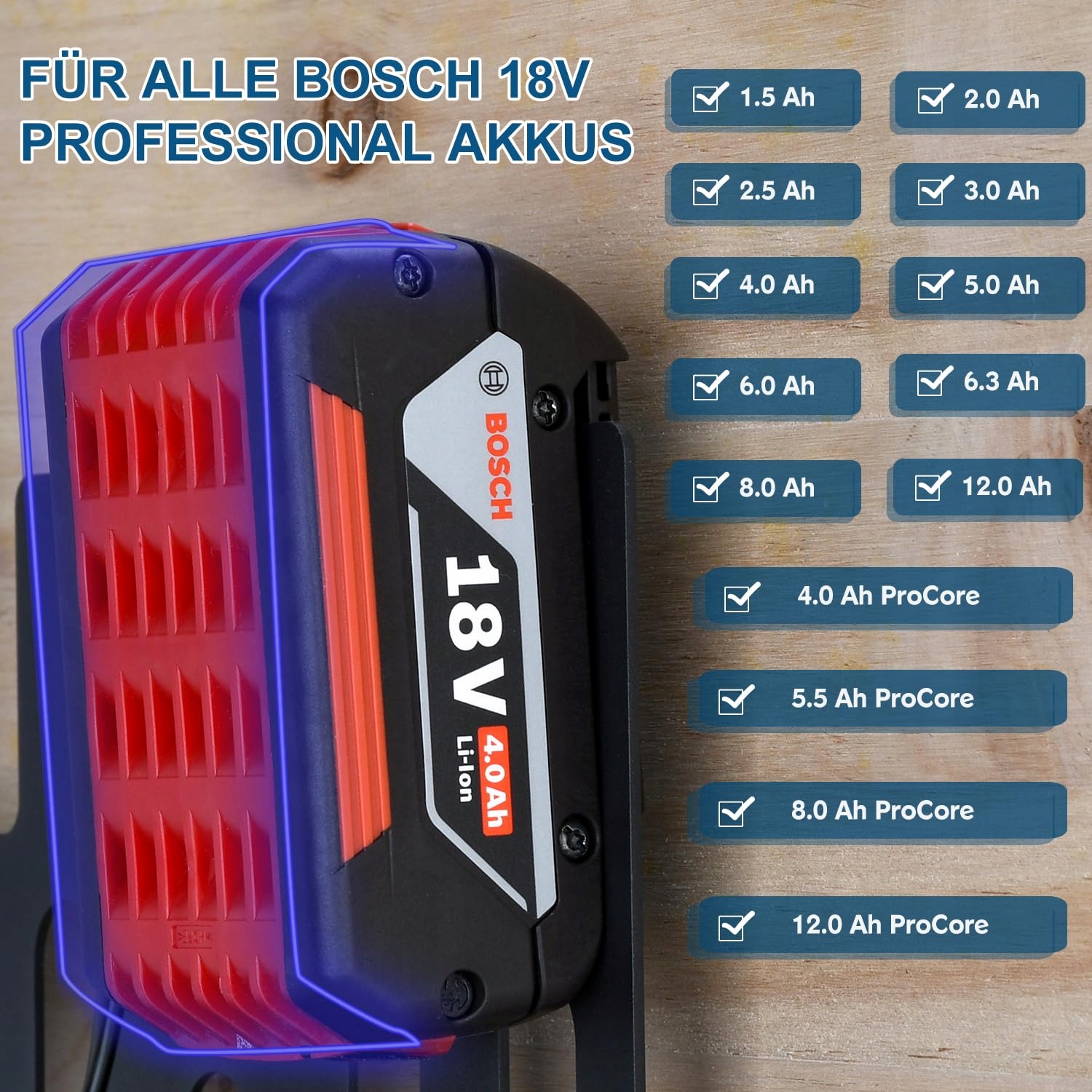 【UCHWYT NA AKUMULATOR I WIESZAK】 3-w-1 wielofunkcyjny uchwyt ścienny na akumulatory, ładowarki i wkrętarki akumulatorowe. Ten uchwyt ścienny jest idealny dla wszystkich akumulatorów Bosch (Professional) 18V, można łatwo zamontować do 4 akumulatorów. Ponadto wieszaki na dole są przeznaczone na wiertarki akumulatorowe, miarki i inne narzędzia, które można zawiesić, aby lepiej zorganizować warsztat i garaż.