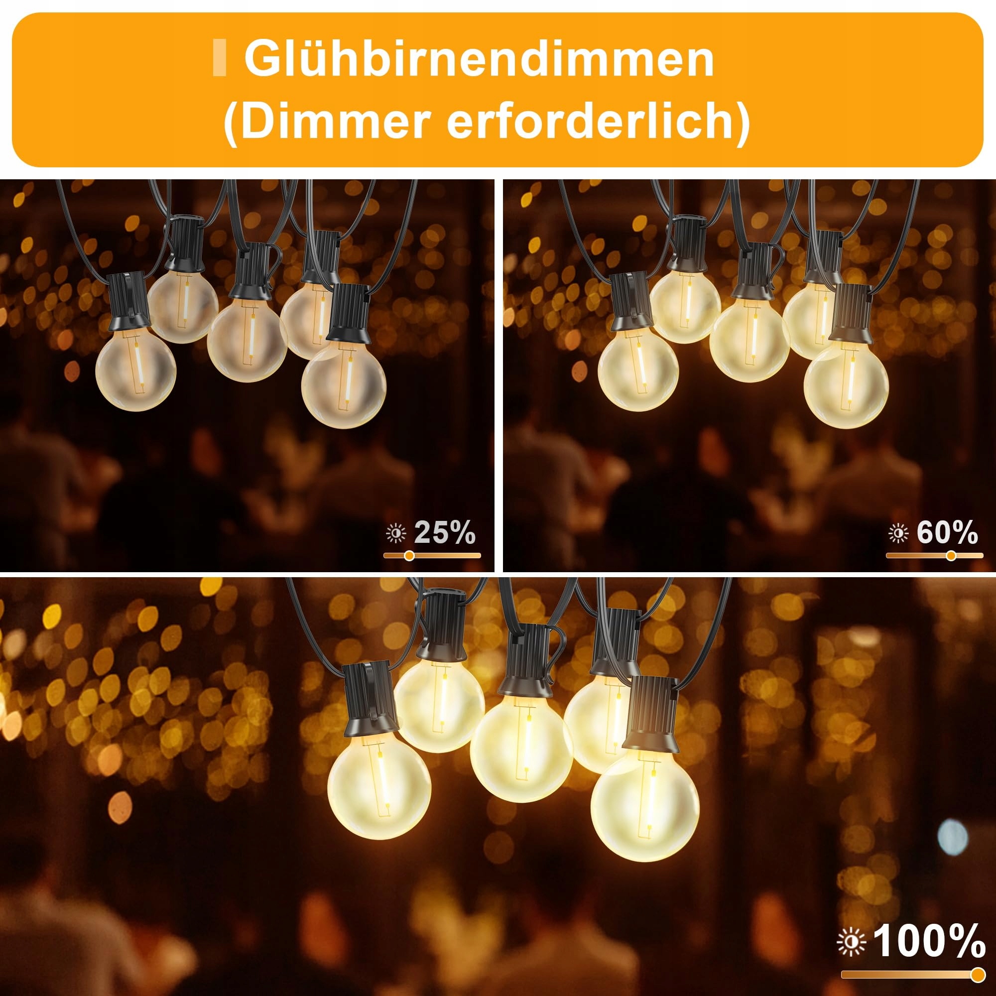 [Dostosowywana atmosfera]Podnieś każdą zewnętrzną przestrzeń dzięki naszym ściemnialnym lichterkette na zewnątrz, które są wyposażone w żarówki LED G40 w stylu vintage i są kompatybilne z różnymi ściemniaczami (nie wchodzą w skład zestawu). Łatwo dostosuj jasność, aby stworzyć idealną atmosferę na każdą okazję, czy to na żywą imprezę, czy na przytulny wieczór w domu