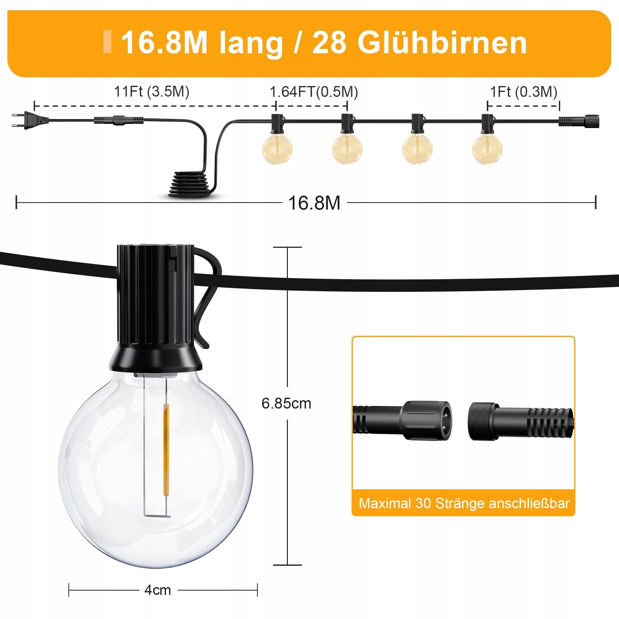 [Energooszczędne oświetlenie]Wyposażone w 30 sztuk 0,5W żarówek LED G40 (w tym 2 zapasowe żarówki), nasze lichterkette na zewnątrz oferują ciepłe oświetlenie o temperaturze 2200K, jednocześnie oszczędzając energię. Z imponującą żywotnością ponad 35 000 godzin, te lichterkette na zewnątrz mogą zmniejszyć koszty energii i konserwacji o ponad 90%
