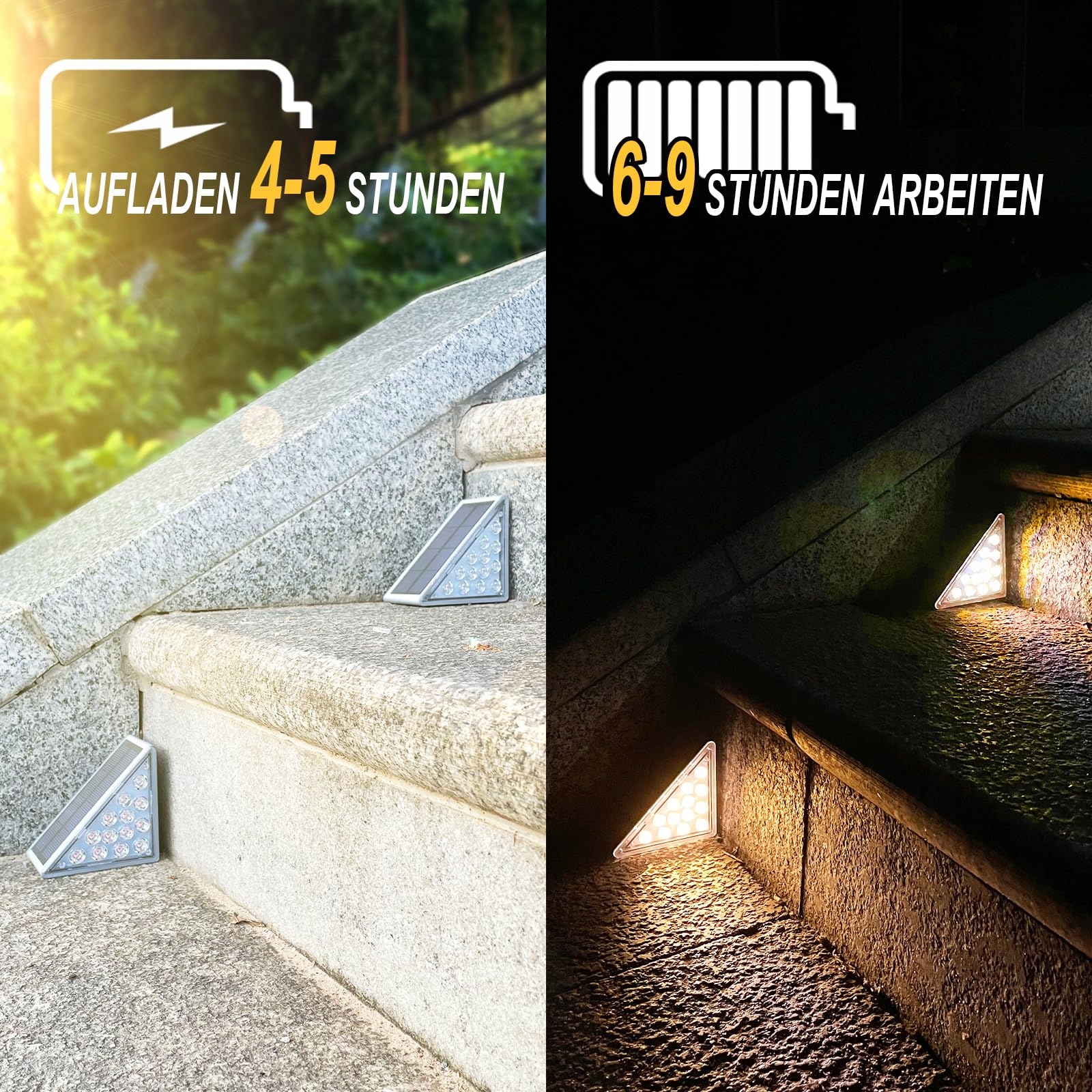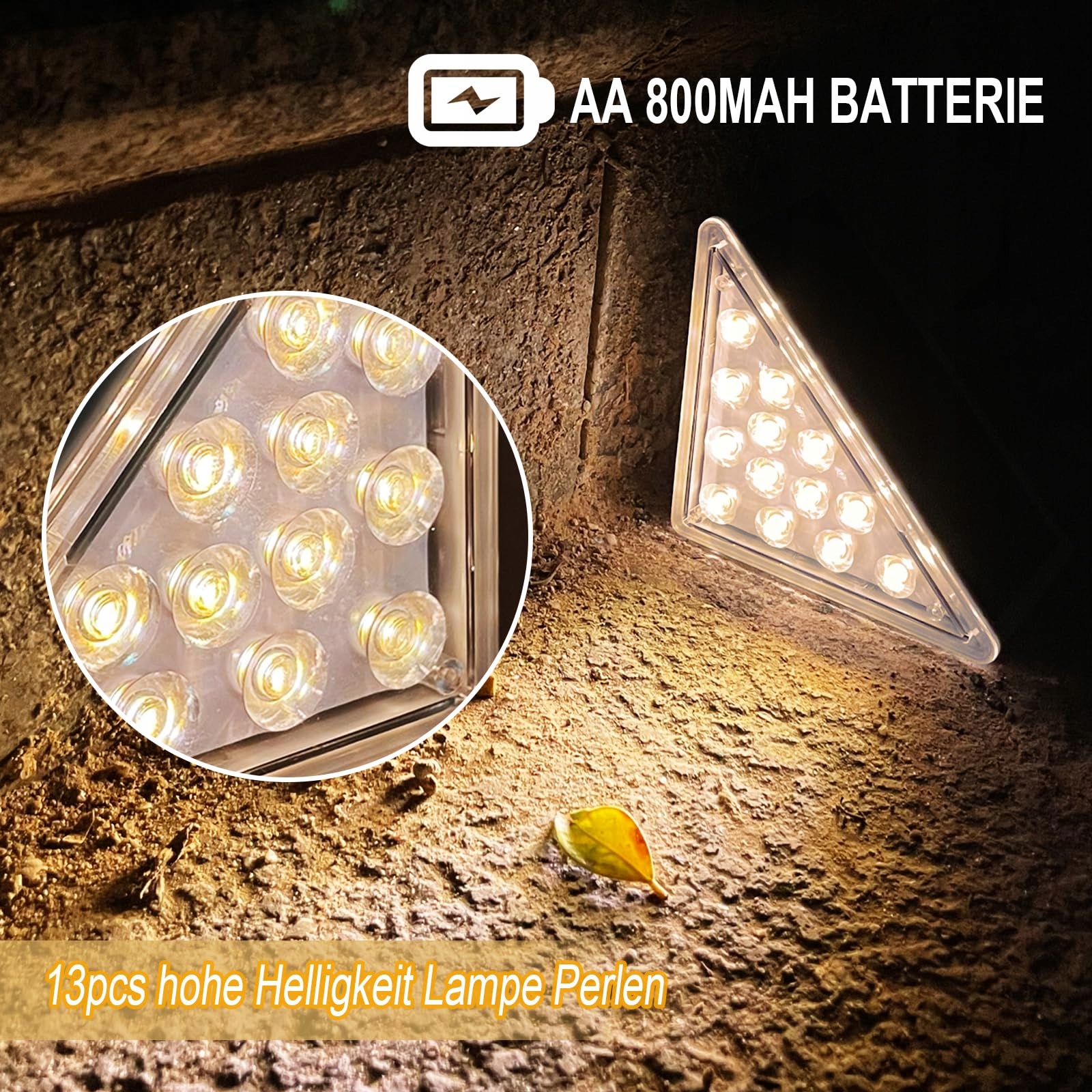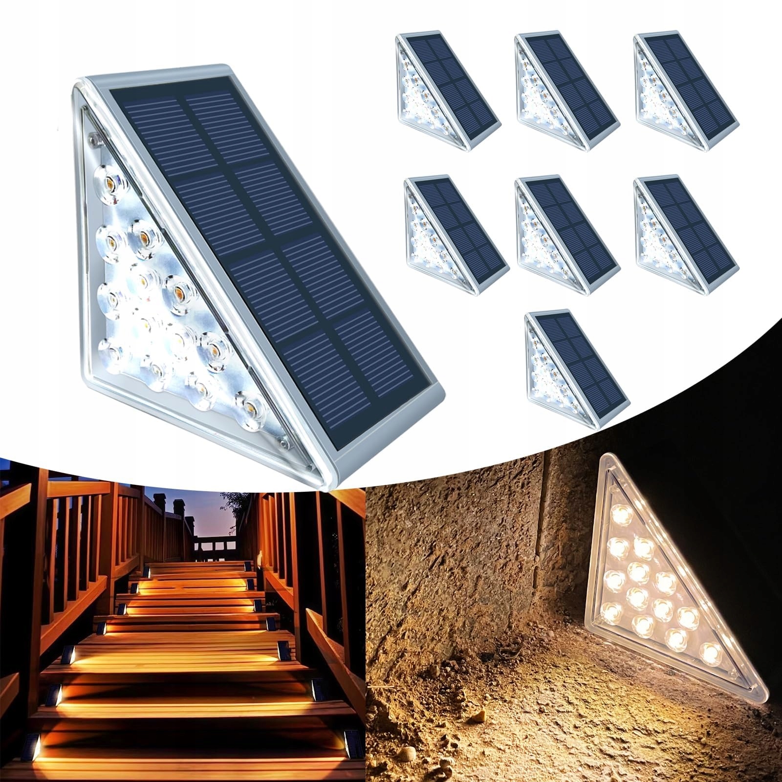 [Perfekcyjne oświetlenie schodów]-- Trójkątna solarna lampa schodowa składa się z 13 diod o wysokiej jasności, które oferują większą jasność niż zwykłe światła schodowe, ciepłe białe światło lub zimne białe światło do wyboru.