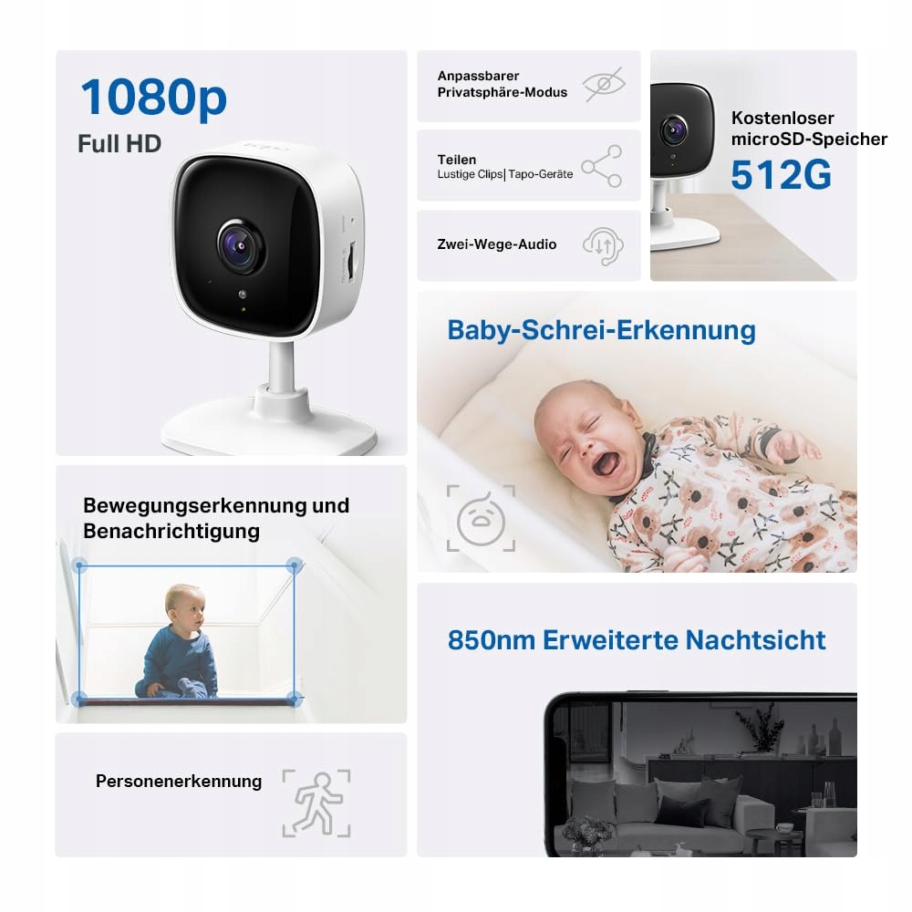 TP-Link Tapo C100 WLAN IP Kamera Monitoringu Wewnętrznego (rozdzielczość 1080p, dwukierunkowe audio, tryb nocny do 9 m, do 128 GB lokalnej pamięci na karcie SD, kompatybilna z Amazon Alexa) Biała
