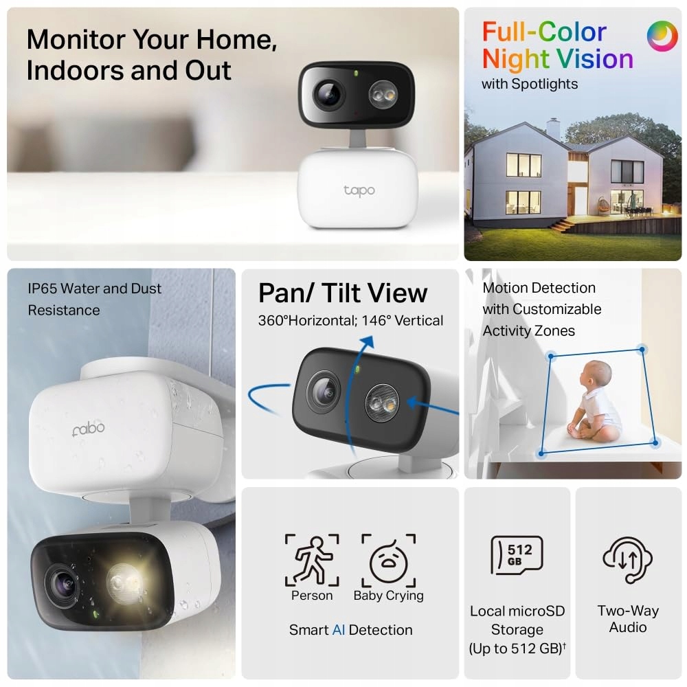 Inteligentne wykrywanie AI – rozpoznaje osoby i płaczące niemowlęta oraz wysyła natychmiastowe powiadomienia. Odporność na warunki atmosferyczne IP65 – odporna na wodę i kurz, idealna do użytku na zewnątrz.