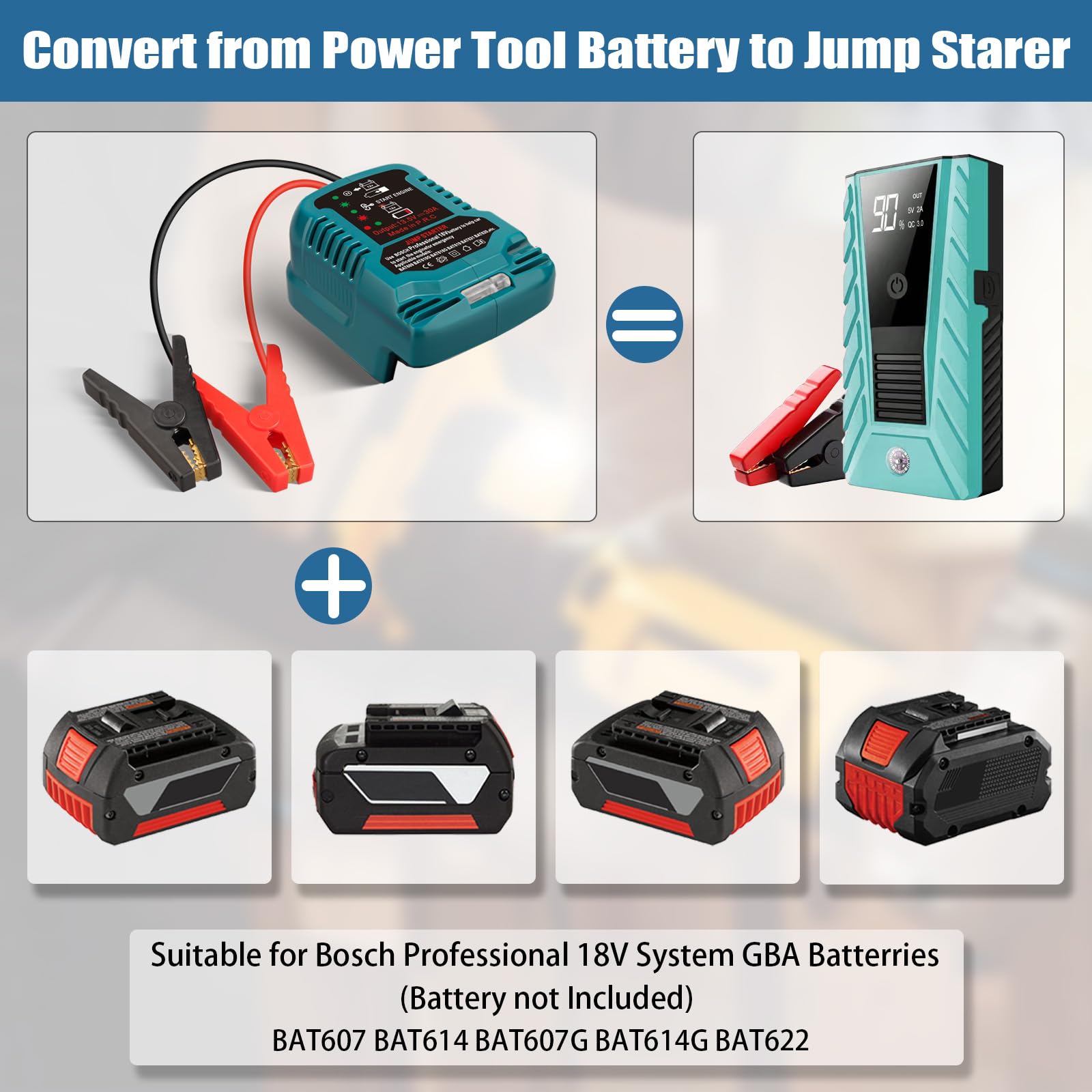 →[Adapter rozruchowy do samochodu]: Adapter rozruchowy do samochodu tylko do samochodów 12V, pasuje do samochodów z silnikami do 3,5L. Zawiera kabel 11 AWG i zaciski, bez baterii, musi być używany z baterią. Wejście DC 18V/20V, maksymalne wyjście 13,5V 30A, maksymalna moc wyjściowa 600W. Ograniczenie prądu w celu ochrony urządzeń elektrycznych w samochodzie, bezpieczne w użyciu.