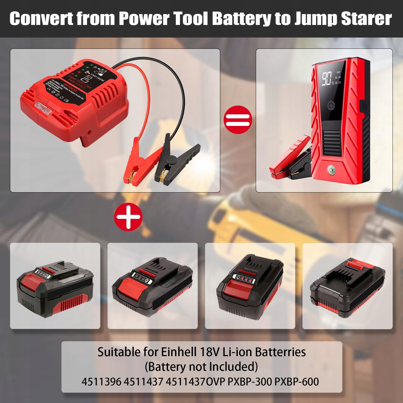 →[Adapter do rozruchu samochodu]: Adapter do rozruchu samochodu tylko do samochodów 12V, pasuje do samochodów z silnikami do 3,5L. Zawiera kabel 11 AWG i zaciski, bez baterii, musi być używany z baterią. Wejście DC 18V/20V, maksymalne wyjście 13,5V 30A, maksymalna moc wyjściowa 600W. Ograniczenie prądu dla ochrony urządzeń elektrycznych w samochodzie, bezpieczne w użyciu.