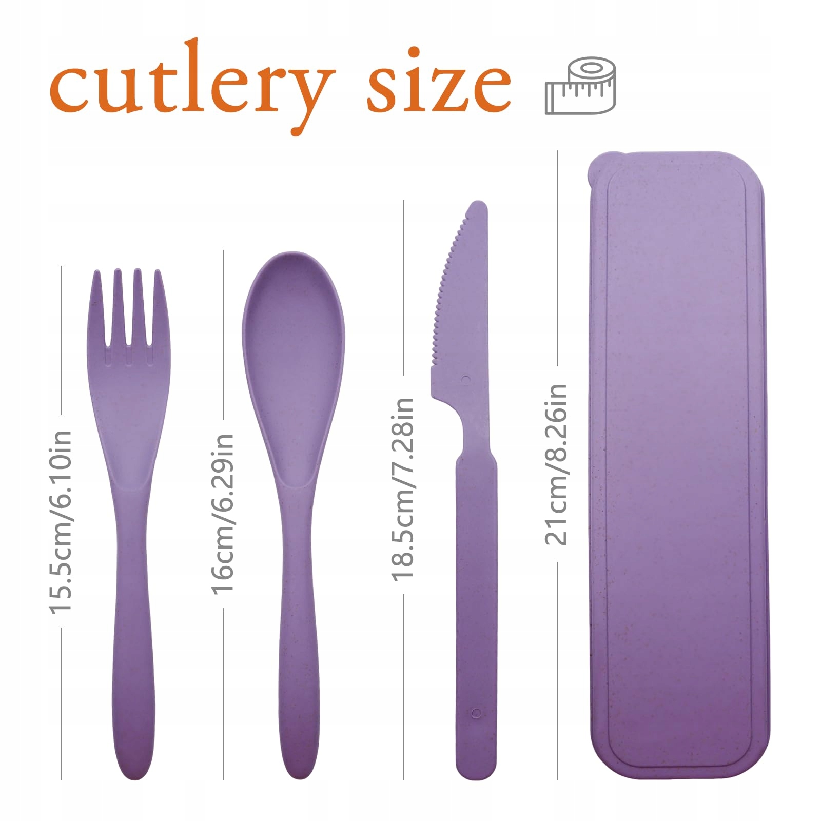 🍀Zestaw Zawiera: Zestaw 4 sztućców podróżnych z tworzywa sztucznego w kolorach pomarańczowym, zielonym, fioletowym, szarym, wszystkie zaprojektowane w stylu nordycko-minimalistycznym, każdy zestaw sztućców zawiera pudełko, widelec, łyżkę i nóż.