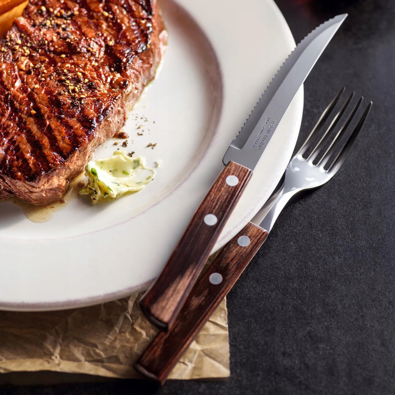 Tramontina zestaw sztućców do steków i pizzy, 12-częściowy zestaw, dla 6 osób, zestaw sztućców do steków, stal nierdzewna, uchwyt z certyfikowanego drewna FSC, nadaje się do mycia w zmywarce