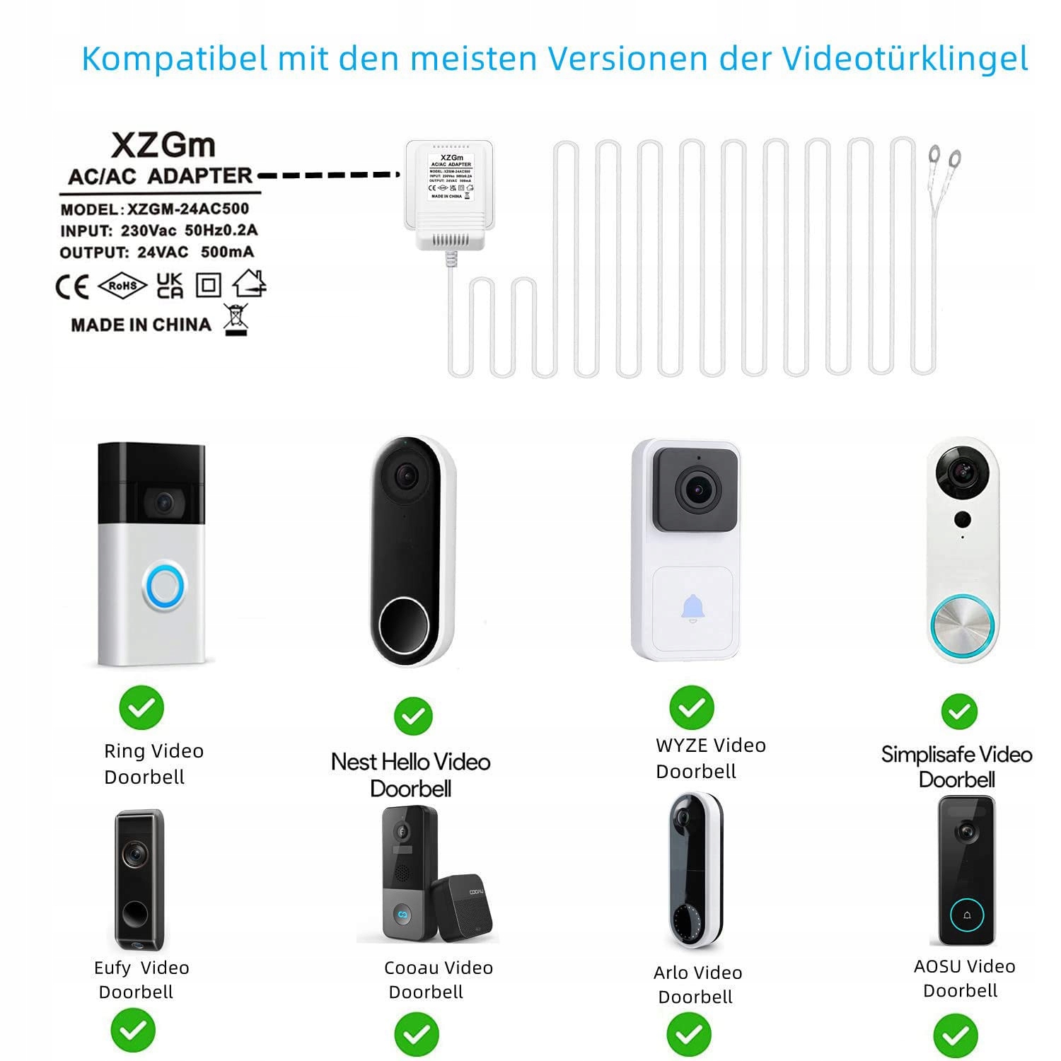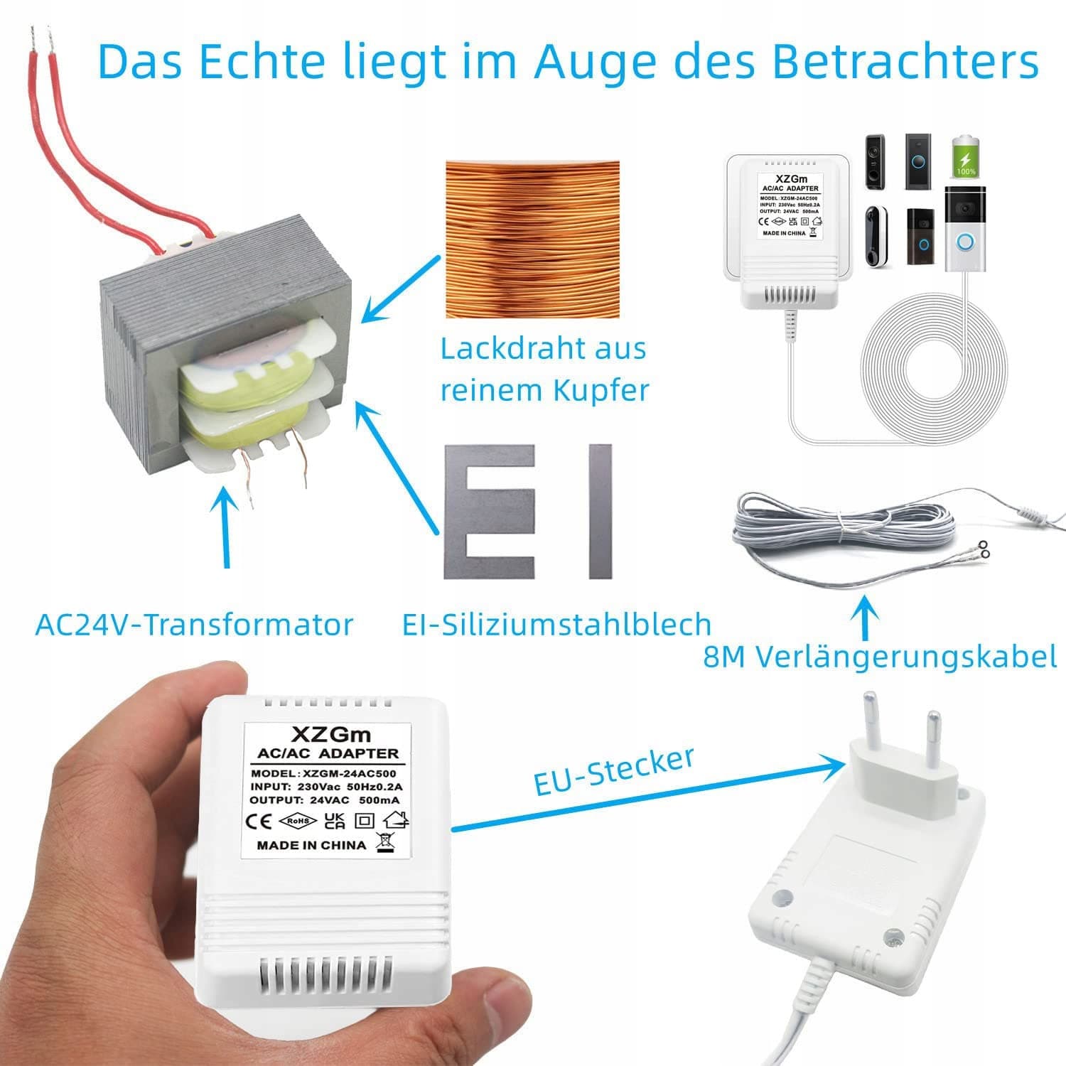Transformator do dzwonka, 24 V 500 mA zasilacz do wideodzwonka Ring Video Doorbell, Ring Video Doorbell Pro i Ring Video Doorbell 2, kompatybilny z Nest Hello Doorbell (przedłużacz 8M)