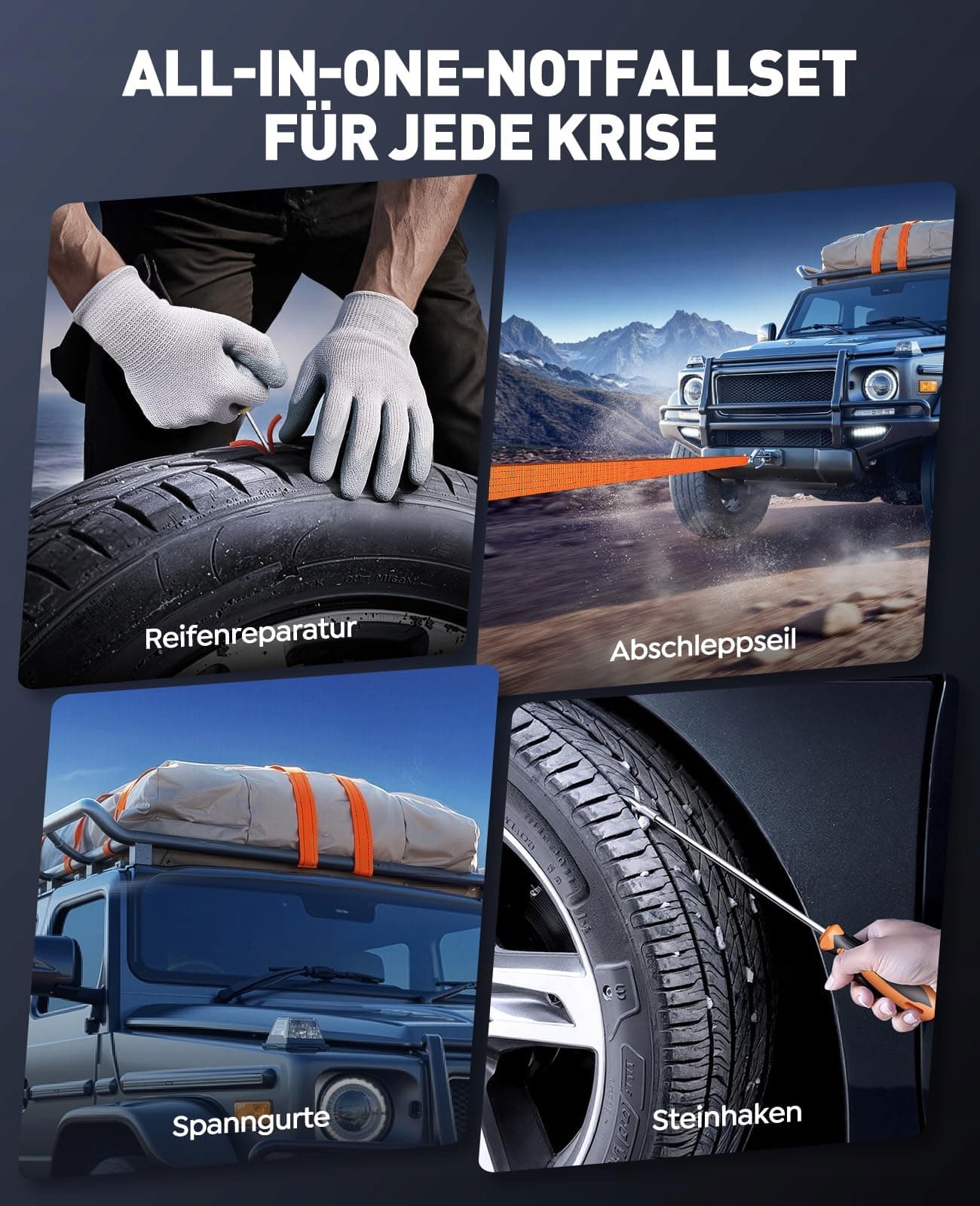 【14-w-1 Powerbank do rozruchu samochodu】 CZAS NA ROZWIĄZANIE ALL-IN-ONE. To nie tylko wzmacniacz samochodowy, ale także kompleksowy zestaw narzędzi awaryjnych dla Twojego samochodu. TK20 Powerbank do rozruchu zawiera rozrusznik, pompę do opon, powerbank, zestaw do naprawy opon, dalekosiężne światło, latarkę, trójkąt ostrzegawczy, narzędzie do hakowania kamieni, zestaw narzędzi awaryjnych, izolowane rękawice, manometr, młotek awaryjny, lina holownicza i pas mocujący. Ten powerbank do rozruchu samochodu jest ergonomicznie zaprojektowany, łatwy do przenoszenia i użytkowania, nadaje się do różnych sytuacji awaryjnych.