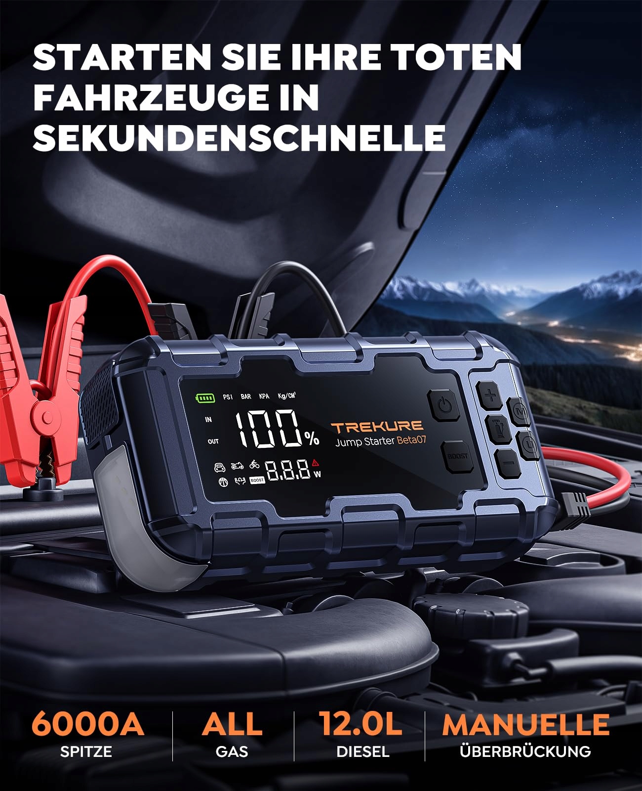 【WIELOFUNKCYJNA ROZRUCHOWA POWERBANKA&ROZKŁADANA RĄCZKA】: Nowa rozruchowa powerbanka Beta07 łączy perfekcyjnie 7 funkcji: rozruchowa powerbanka, pompa do opon, powerbanka, latarka, SOS, trójkąt ostrzegawczy i miernik ciśnienia w oponach. Przekracza granice tradycyjnych starterów i jest najlepszym partnerem dla Twoich aktywności na świeżym powietrzu. Wyposażona w stabilną, rozkładaną rączkę, humanizowany design sprawia, że produkt jest łatwy do przenoszenia i przemieszczania.
