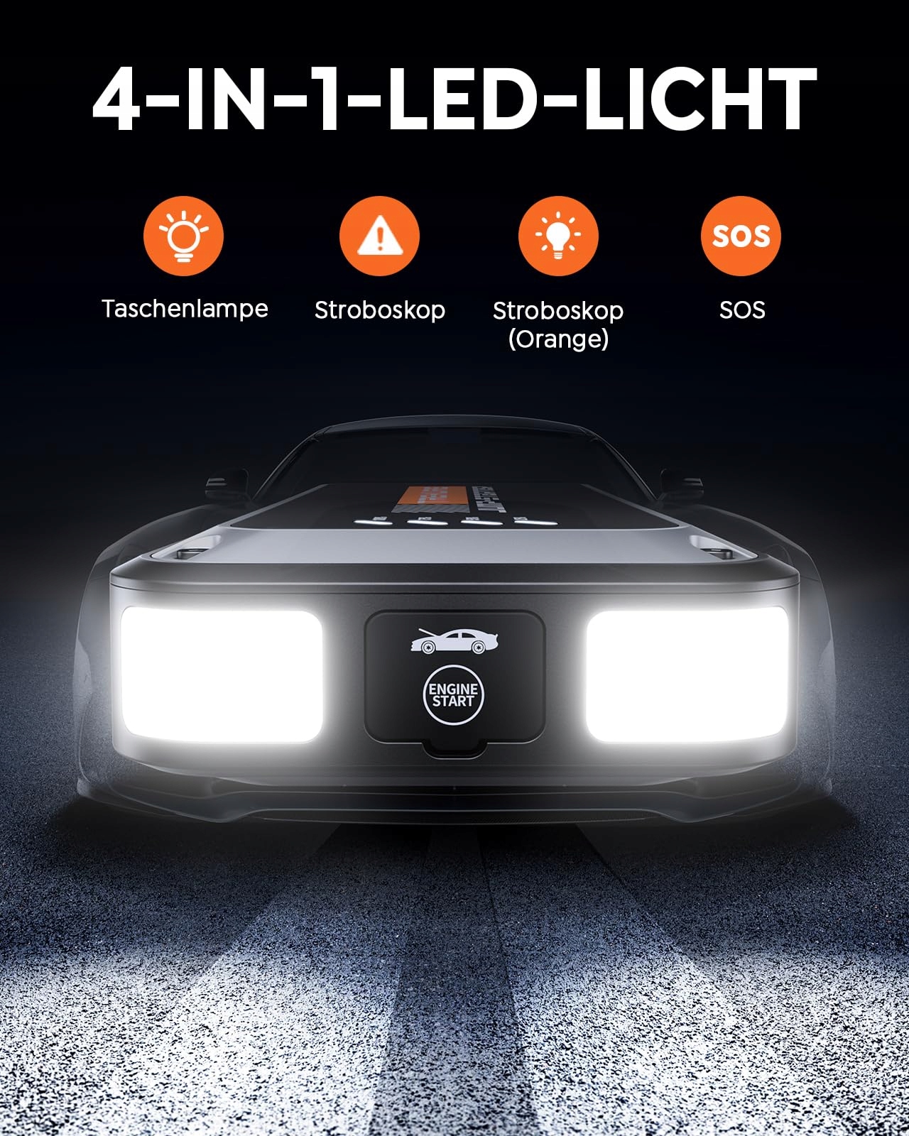 【4 tryby światła LED】Rozrusznik samochodowy Powerbank posiada 4 tryby światła LED, które można przełączać między oświetleniem, białym stroboskopem, pomarańczowym stroboskopem i trybem SOS. Tryb oświetlenia jest odpowiedni do wymiany opon lub inspekcji silnika, tryb stroboskopowy służy do ostrzegania lub przyciągania uwagi, a tryb SOS jest idealny na przygody na świeżym powietrzu. Te funkcje są niezbędne w trudnych sytuacjach i zwiększają Twoje bezpieczeństwo.