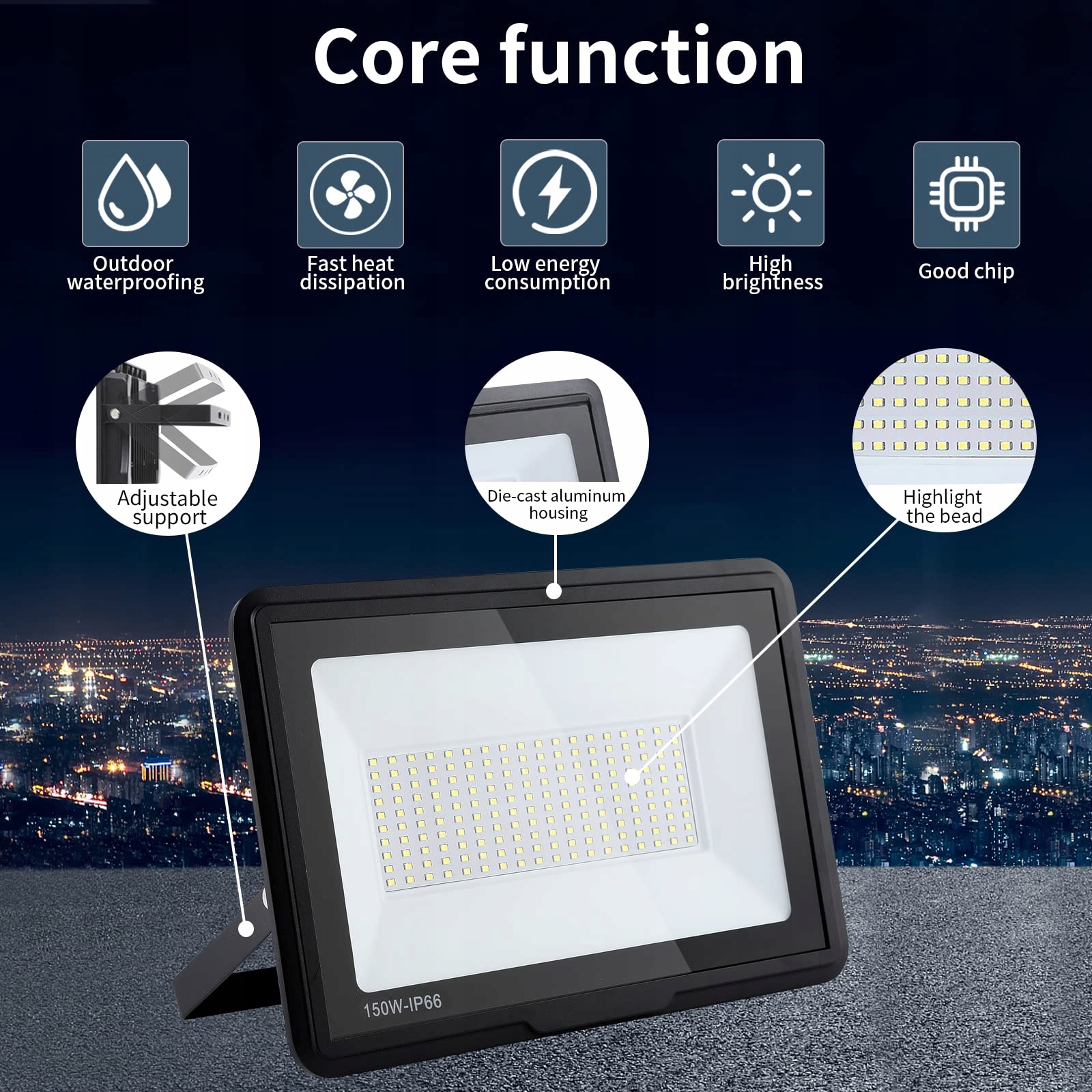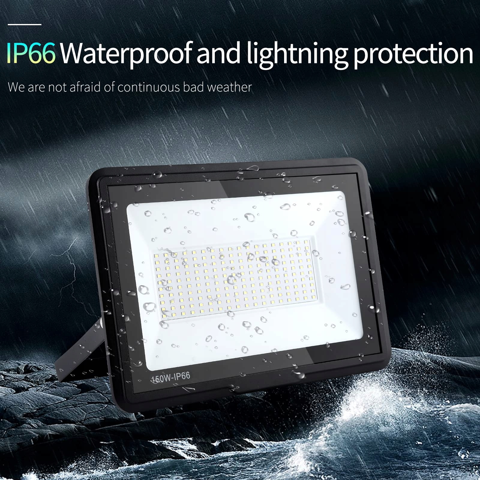 【IP66 Wodoodporny】Stopień ochrony reflektora LED to IP66. Zintegrowana konstrukcja jest odporna na wilgoć i kurz. Dzięki innowacyjnemu projektowi zintegrowanego radiatora z tyłu, reflektory mogą być używane na zewnątrz przez długi czas, niezależnie od słońca, deszczu czy śniegu.