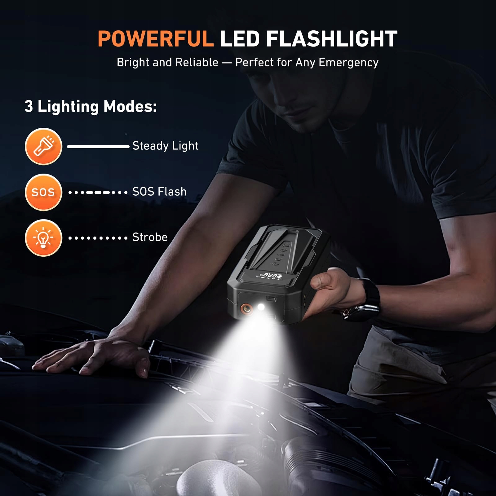 Jasna latarka LED z 3 trybami: Oświetl sobie drogę w nagłych wypadkach za pomocą mocnej wbudowanej diody LED. Wybierz między światłem ciągłym, sygnałem SOS lub stroboskopem – idealne do nocnych awarii, sygnalizacji lub napraw na poboczu drogi.