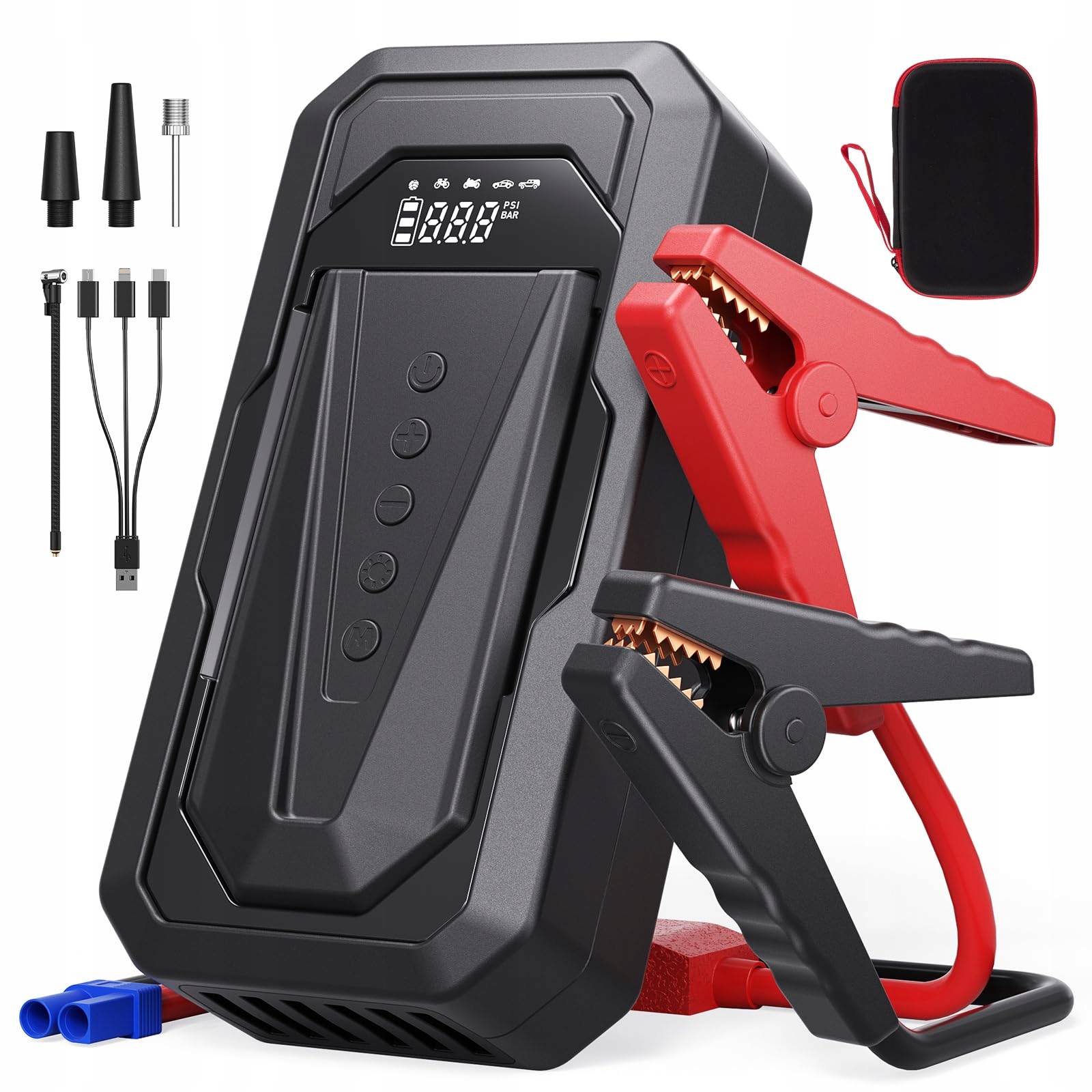 Wielofunkcyjny rozrusznik-booster Powerbank: To wszechstronne urządzenie łączy w sobie rozrusznik pojazdu, kompresor powietrza 150 PSI, monitorowanie ciśnienia w oponach w czasie rzeczywistym, szybkie ładowanie i oświetlenie awaryjne. Niezależnie od tego, czy jesteś na wycieczce, czy utknąłeś w sytuacji awaryjnej na drodze – to niezbędne narzędzie, które pozwoli ci ruszyć w drogę.
