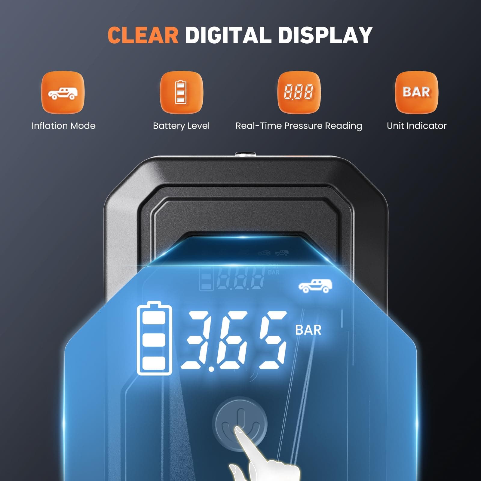 Zintegrowany kompresor powietrza: Precyzyjnie i bez wysiłku napompuj opony, piłki i nadmuchiwane przedmioty. Pompa 21-cylindrowa obsługuje 3 tryby pompowania i 4 jednostki ciśnienia (PSI, BAR, KPA, kg/cm²). Intuicyjny cyfrowy wyświetlacz pokazuje poziom baterii, wartości ciśnienia, tryb pompowania i jednostki w czasie rzeczywistym.