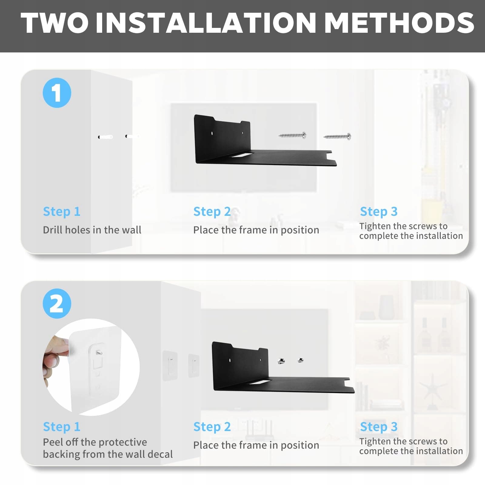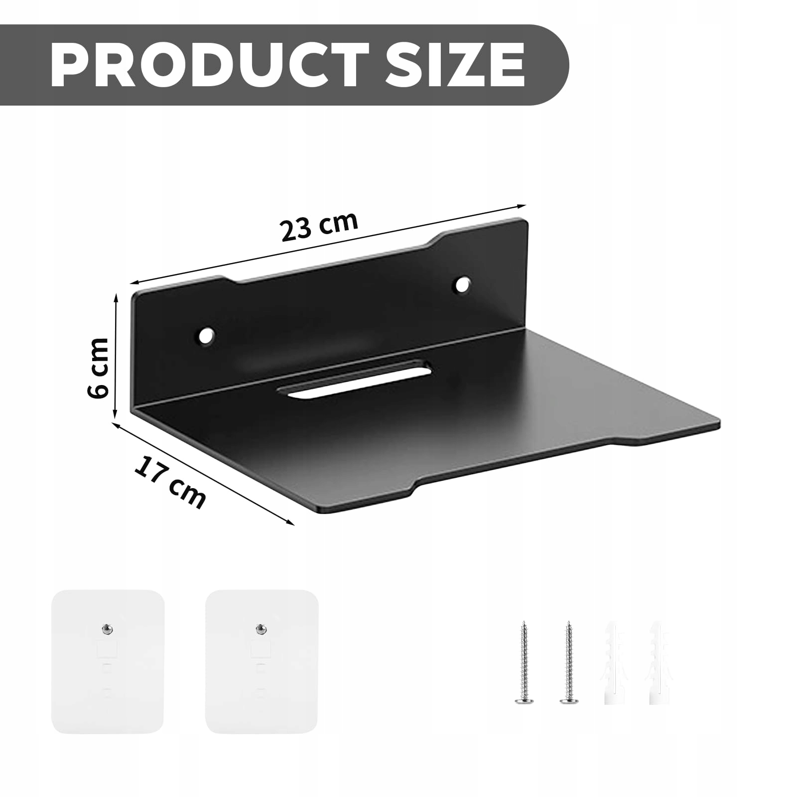 Wskazówki dotyczące instalacji: Proszę przed zakupem sprawdzić, czy rozmiar uchwytu do monitoringu jest odpowiedni. Jeśli używasz metody montażu bez wiercenia, przed instalacją oczyść ścianę, następnie usuń folię ochronną z haczyka i przymocuj półkę do ściany. Półka może być używana dopiero po 24 godzinach od instalacji.