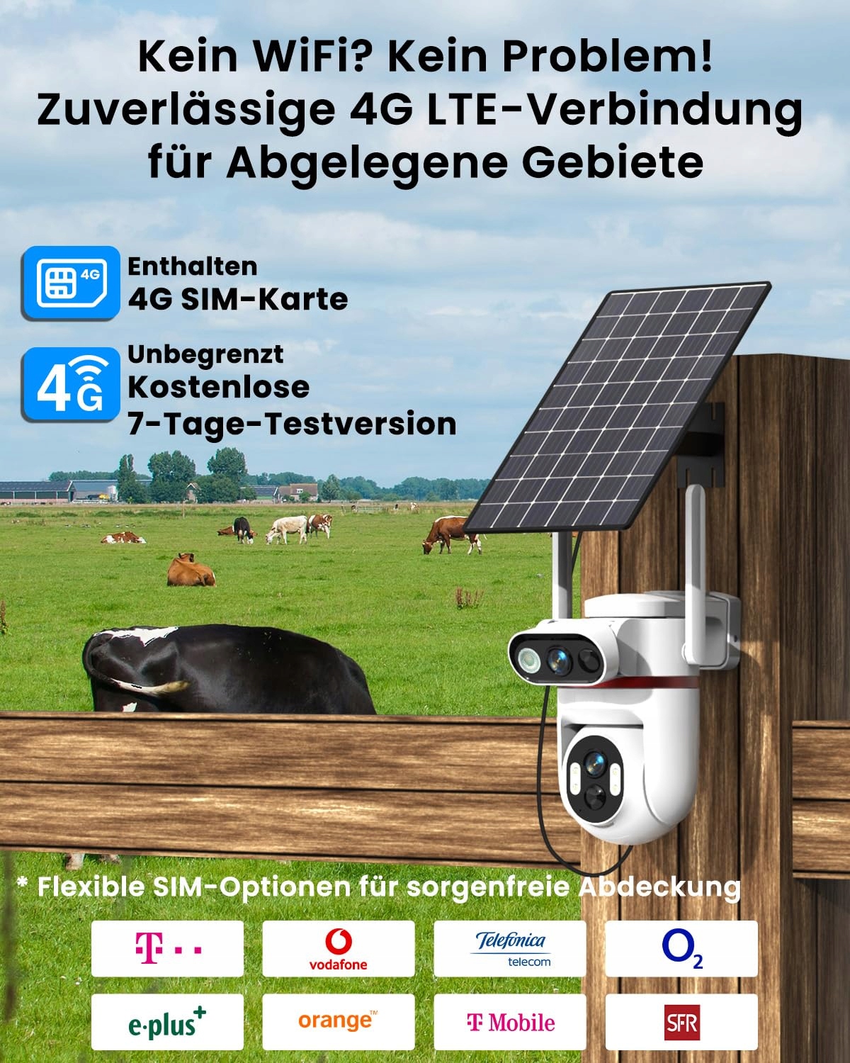 【Plug & Play z 4G SIM】Kamera monitoringu zewnętrznego solarna UCOCARE jest dostarczana z kartą SIM 4G, która obejmuje 7 dni nieograniczonych danych. Brak skomplikowanej konfiguracji, nie jest wymagane Wi-Fi. Po okresie testowym możesz wygodnie wybrać tani abonament bezpośrednio w aplikacji lub użyć swojej karty SIM 4G od dużego operatora dla niezawodnego lokalnego zasięgu.